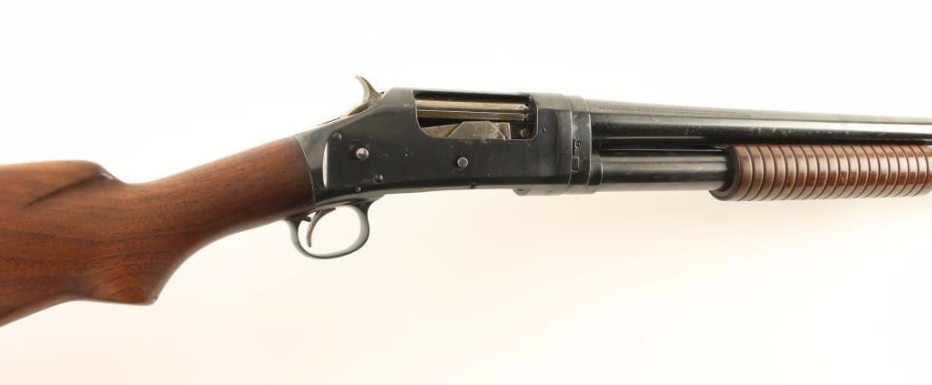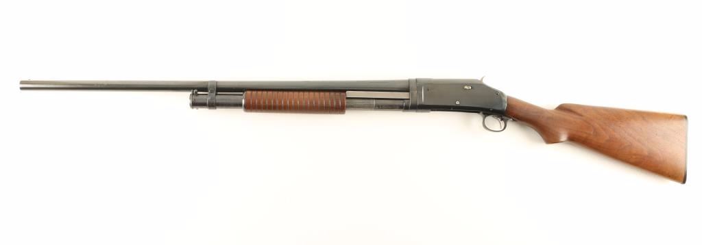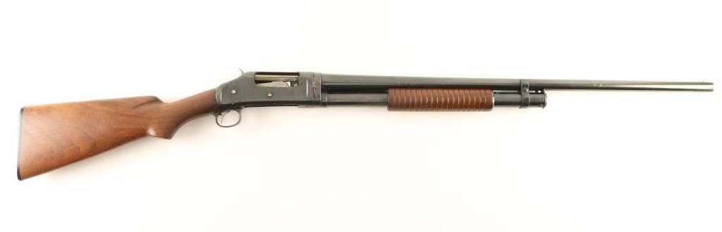 Refinished slide action repeating shotgun chambered for 2 3/4" 16 gauge shells, circa 1942. Features a blued refinish, full choke 28" take-down barrel, bead front sight, 1/2 tube magazine, exposed hammer with checkered spur, steel receiver, grooved walnut slide handle and semi-pistol grip wood shoulder stock with factory buttplate. Shotgun exhibits approximately 75% of the refinish showing scattered pitting on barrel and receiver with old pitting visible under the finish on the receiver as well. Action is smooth, bore is bright and wood stocks are fine. Condition is good. ***C&R Firearm*** ***Modern Firearm***
