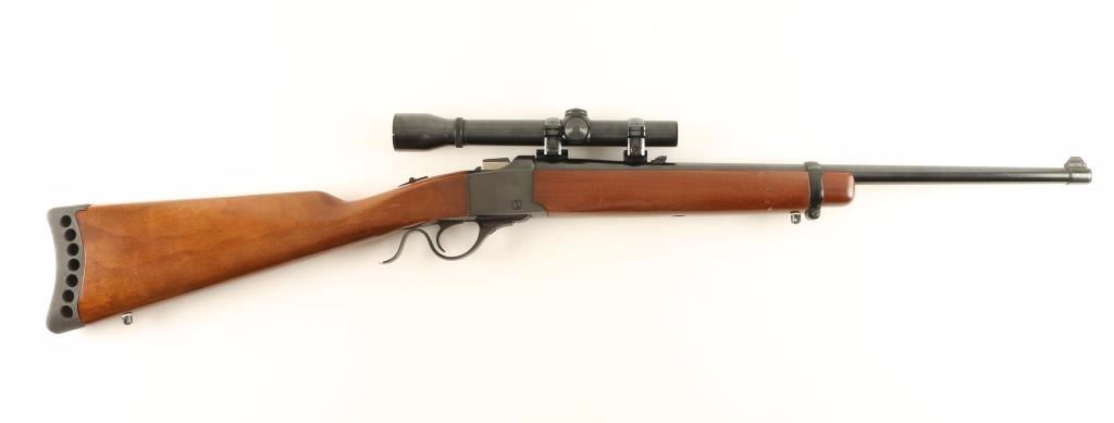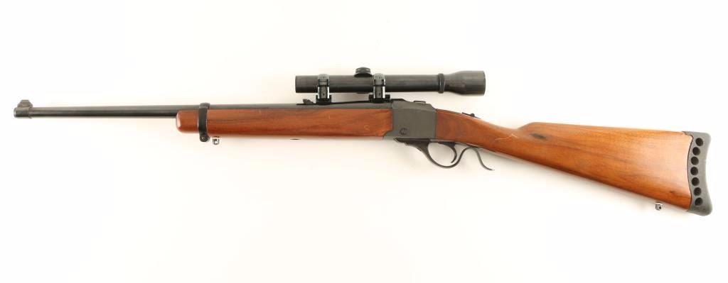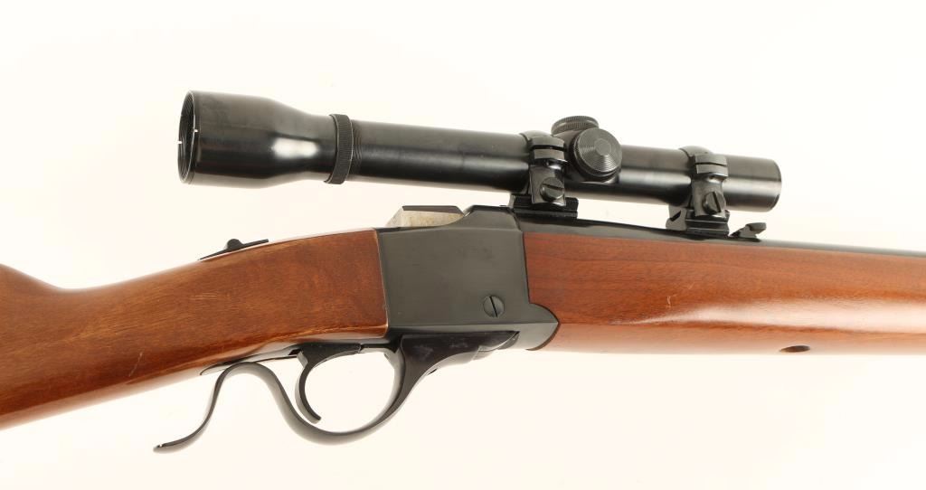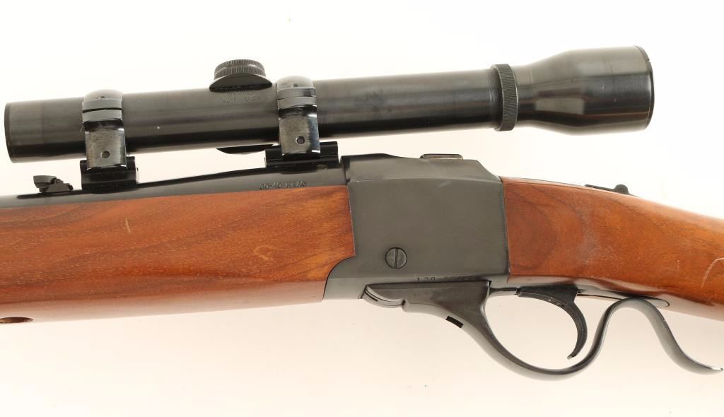American single shot falling block rifle chambered in .30-40 Krag, circa 1976. Features blued finish, 22" semi-heavy barrel, blade front sight, adjustable folding leaf rear sight, Weaver K3-F fixed power scope, serrated trigger, sliding tang safety, "S" shaped lever, swivel studs, single barrel band, smooth walnut forend and straight grip shoulder stock with rubber recoil pad. Rifle shows very little use or wear. Action is smooth, bore is excellent, optics are excellent, and wood stocks are near fine with a few minor imperfections. Condition is excellent. ***Modern Firearm***