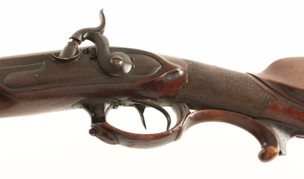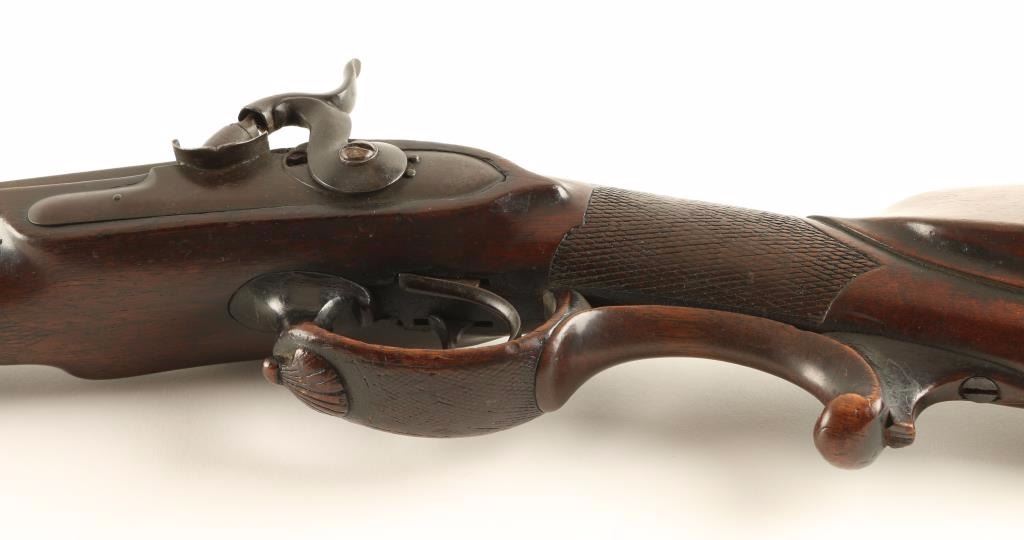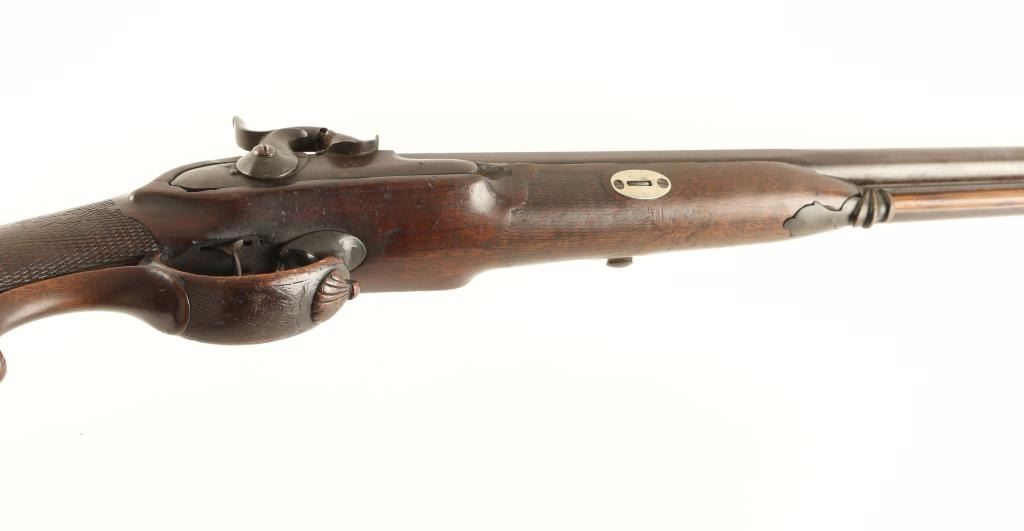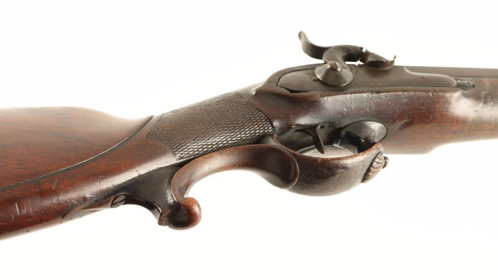Finely crafted early German made percussion double barrel sidelock shotgun. Features 32" damascus barrels with concave rib, small blade front sight, wood ram rod with cartridge case tip, smooth hammer spurs, double triggers, sling swivel, ornate wood trigger guard & forend tip and checkered straight grip shoulder stock with cheek rest. Shotgun's finish has moved to a deep red/brown patina with the damascus pattern still evident. Action is sound, bore is clear and wood stock is good with worn checkering & some cracks. A very nice old shotgun than would make an excellent addition to an early arms collection or display piece. Condition is very good+. ***Antique Firearm***