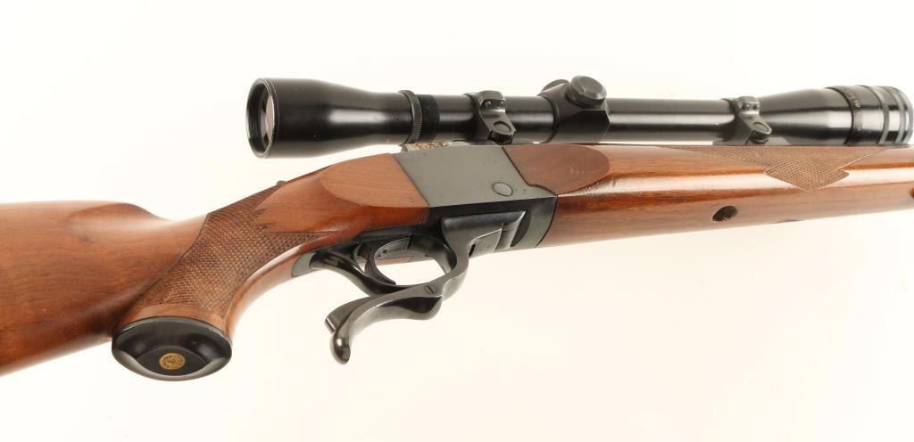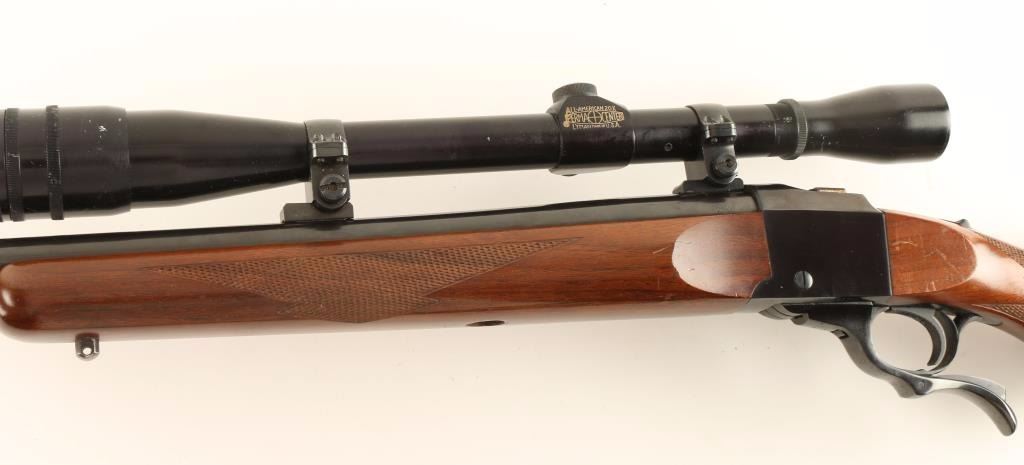 American single shot falling block rifle chambered in .25-06 Remington, circa 1970. Features a blued finish, heavy 28" barrel, no sights, Lyman All American 20x scope, serrated trigger, sliding tang safety, swivel stud, checkered walnut forend and pistol grip shoulder stock with rubber recoil pad & metal grip cap. Rifle retains approximately 94% of it's original finish with a small amount of scattered surface rust on barrel, lever and the right side of the receiver. Action is smooth, bore is excellent, optics are clear and wood stocks are fine. Condition is very good++. ***Modern Firearm***