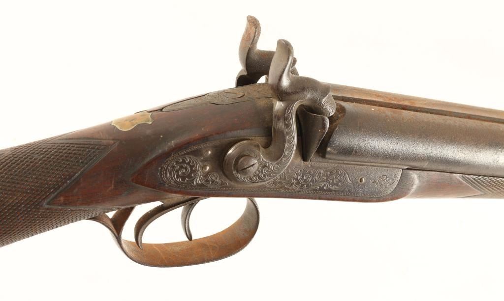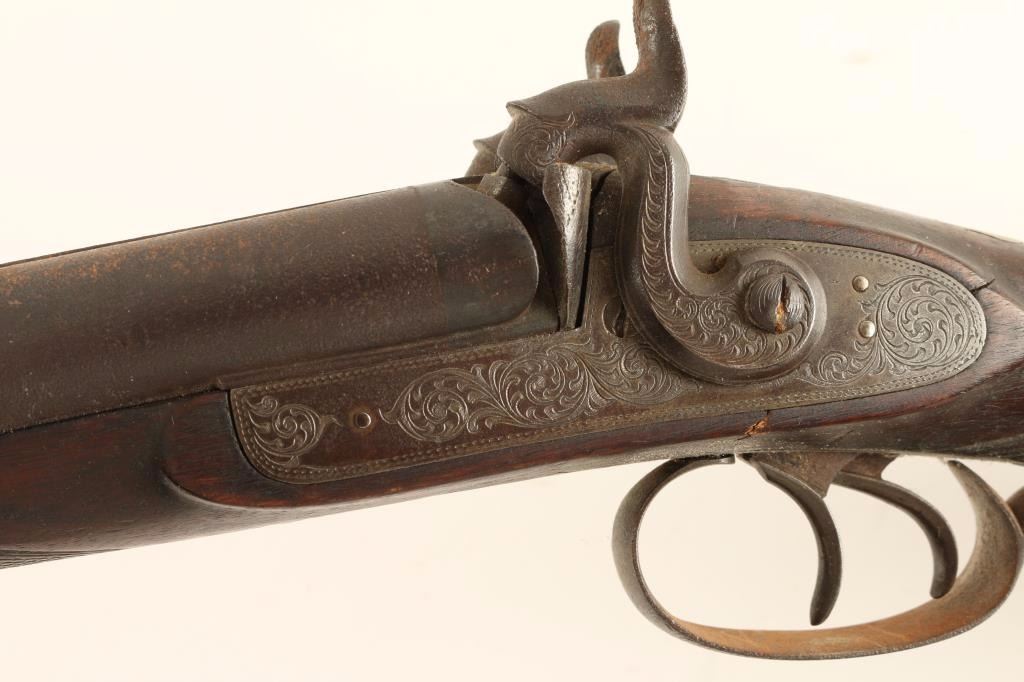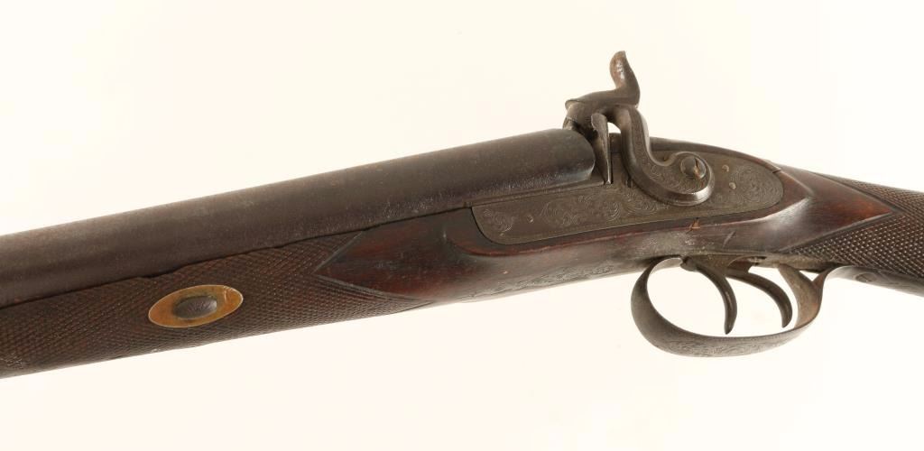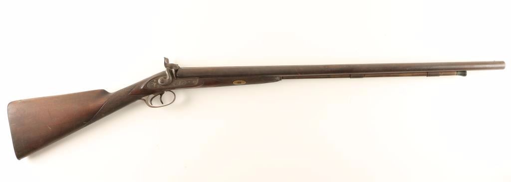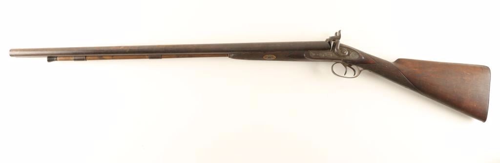 Nice unsigned antique percussion double barrel shotgun. Features 30" damascus steel barrels with concave rib, bead front sight, wood ram rod, serpent head hammers, scroll engraving, double triggers and one piece checkered wood shoulder stock with metal buttplate. The finish on the locks have turned to an appealing brown patina while the other metal surfaces have begun to rust, especially on the top of the barrel. Action works and high quality wood stock is good showing a few cracks near the wrist. Condition is fair. ***Antique Firearm***