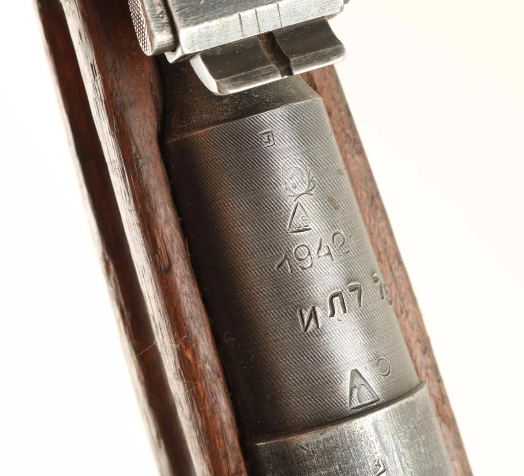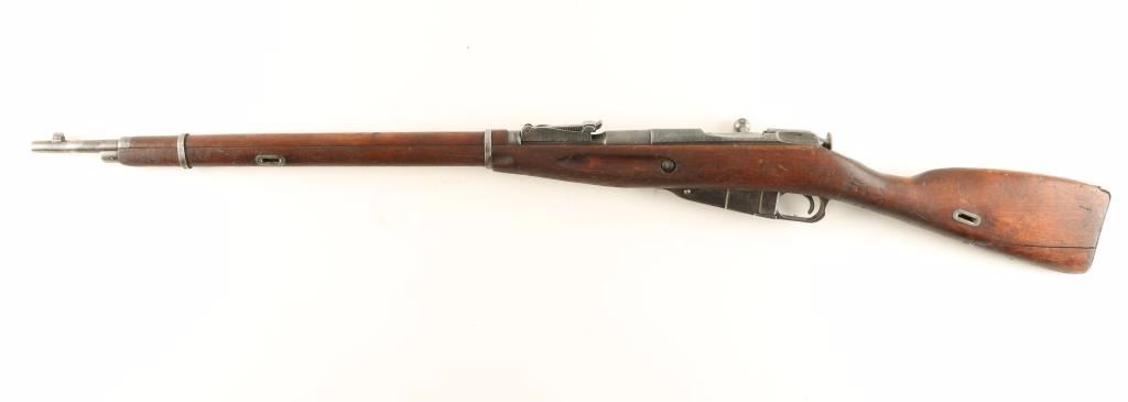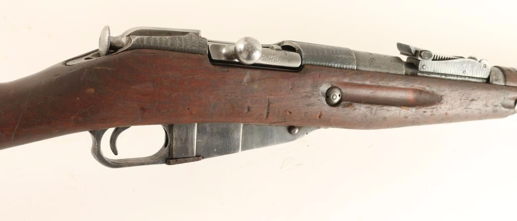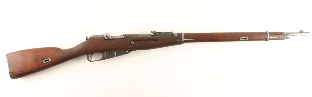 Russian military bolt action service rifle chambered in 7.62x54Rmm, circa 1942. Featured a blued finish, Izhevsk marked 28.7" tapered barrel, blade front sight, graduated rear sight to 2,000 meters, internal box magazine, straight bolt handle, two barrel bands, smooth wood handguard and straight grip shoulder stock with metal buttplate. Serial numbers match on barrel, floorplate, buttplate & receiver. Import marks on barrel. Finish is approximately 50% intact showing even wear and some surface rust on the floorplate. Action functions well, bore is dark with good rifling and wood stock has a large crack at the toe. Condition is near good. ***C&R Firearm*** ***Modern Firearm***