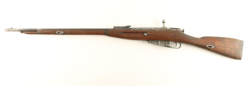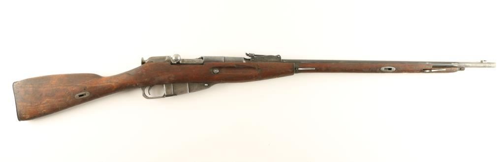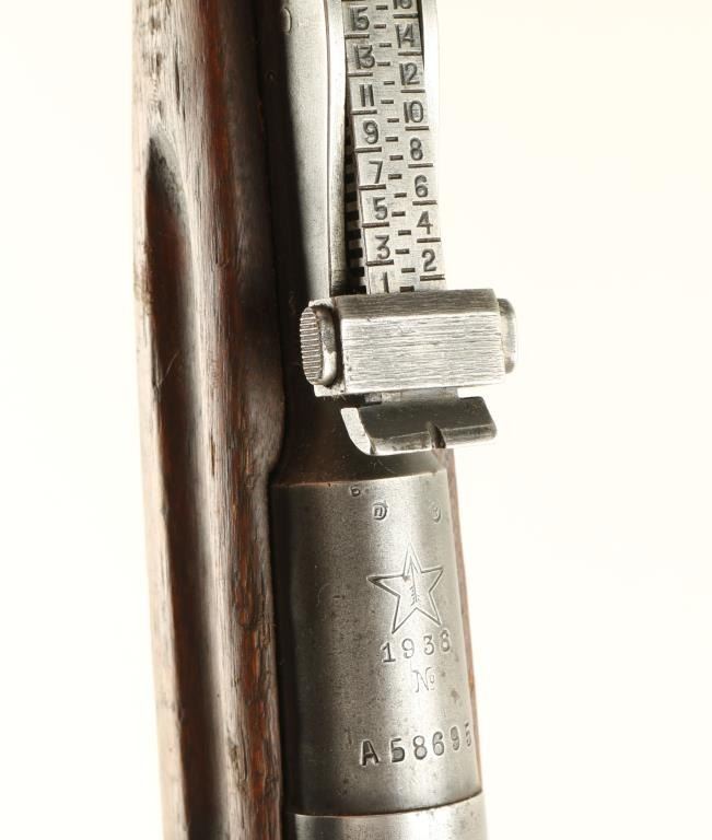Russian military bolt action service rifle chambered in 7.62x54Rmm, circa 1938. Featured a blued finish, Tula marked 28.7" tapered barrel, no front sight, graduated rear sight to 2,000 meters, internal box magazine, straight bolt handle, no barrel bands or handguard and a straight grip wood shoulder stock with metal buttplate. Matching serial numbers on barrel, receiver and buttplate. Import marks on barrel. Finish is approximately 67% intact showing heavy wear and some light scattered surface rust on barrel & magazine. Action functions well, bore is dark with good rifling and shoulder stock is fair. Condition is near good. ***C&R Firearm*** ***Modern Firearm***