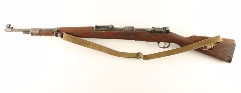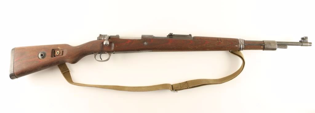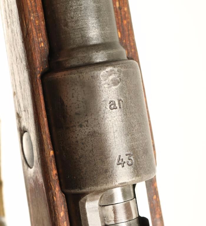 WWII era German military bolt action rifle, chambered in 8mm Mauser, circa 1943. Features a blued finish, 24" tapered barrel, shrouded blade front sight, graduated rear sight to 20,000 yards, two barrel bands, bayonet lug, smooth trigger, internal box magazine, safety switch on bolt, smooth laminated wood handguard and semi-pistol grip shoulder stock with metal buttplate. Matching numbers on receiver, bottom metal, follower & floorplate. Receiver is marked ar 43 and barrel has import marks. Rifle's finish is turning to a light grey patina with defaced waffenamts. Action is smooth, bore is dark with good rifling, and wood stocks are good to very good. Condition is good. ***C&R Firearm*** ***Modern Firearm***