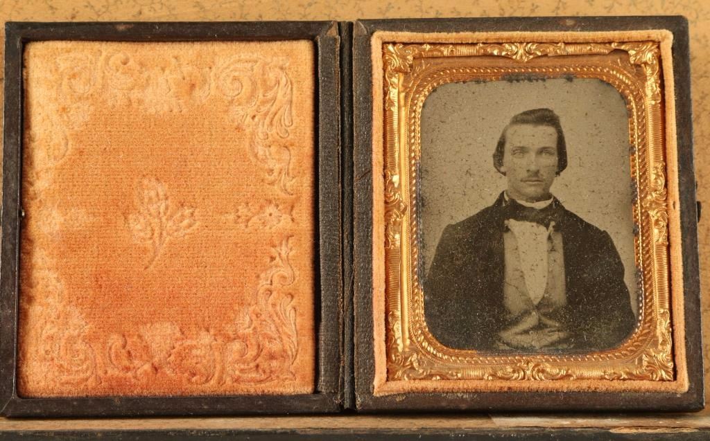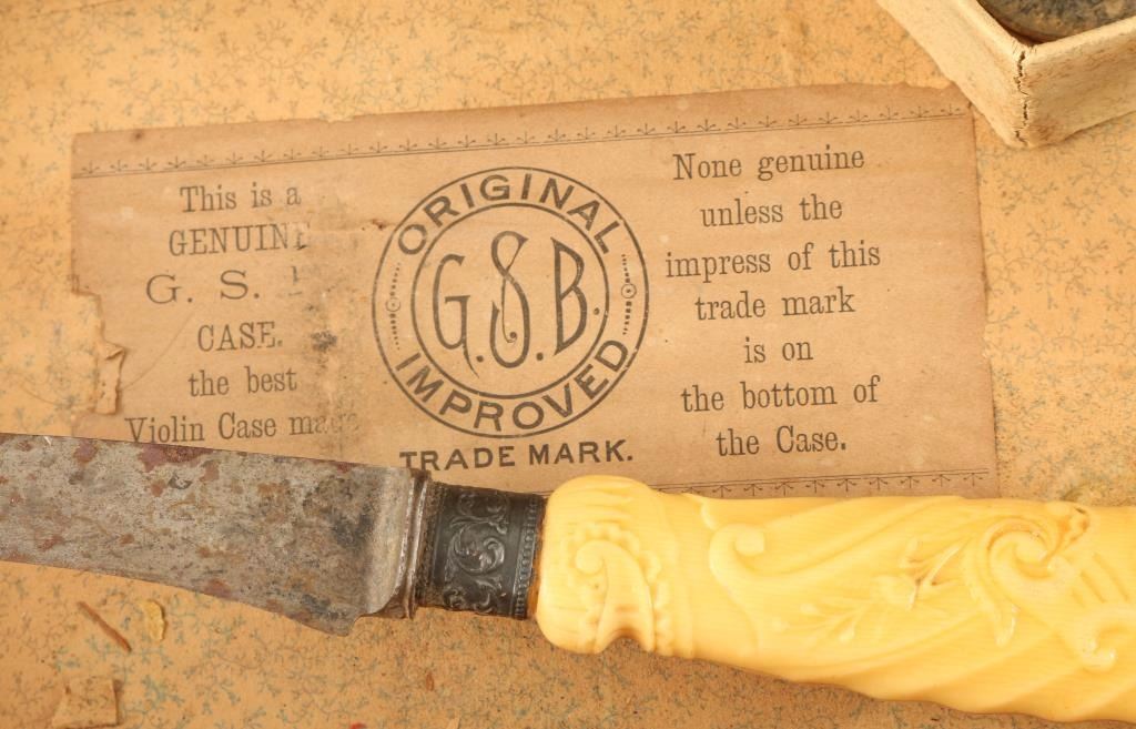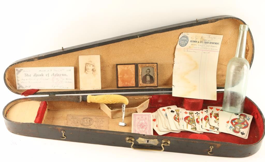 Violin case with gambler's items including; "ace up the sleeve" clip and assorted playing cards, tintype of gentleman in suit, photo of young girl with hand written note on the back, repro Bank of Arizona note for $100 dated May,1886, gold cufflinks, receipt from Goldman & Co's Liquor Department dated 1884 and much more.