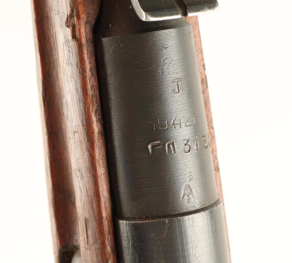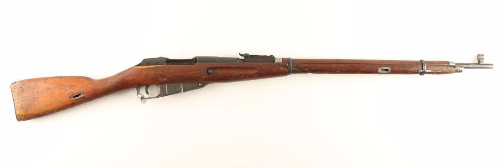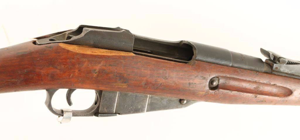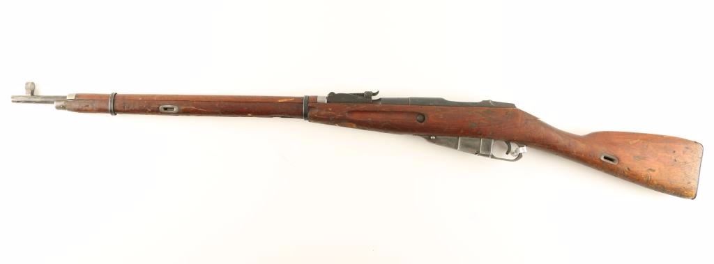 Russian military bolt action parts chambered in 7.62x54Rmm, circa 1942. Featured a blued finish, Izhevsk marked 28.7" tapered barrel, hooded post front sight, graduated rear sight to 2,000 meters, no bolt, internal box magazine, two barrel bands, smooth wood handguard and straight grip shoulder stock with metal buttplate. Matching serial numbers on barrel and receiver. Import marks on barrel. Finish is approximately 80% intact. Bore is very dark with good rifling and shoulder stock is fair showing damage. Condition is near good. ***C&R Firearm*** ***Modern Firearm***