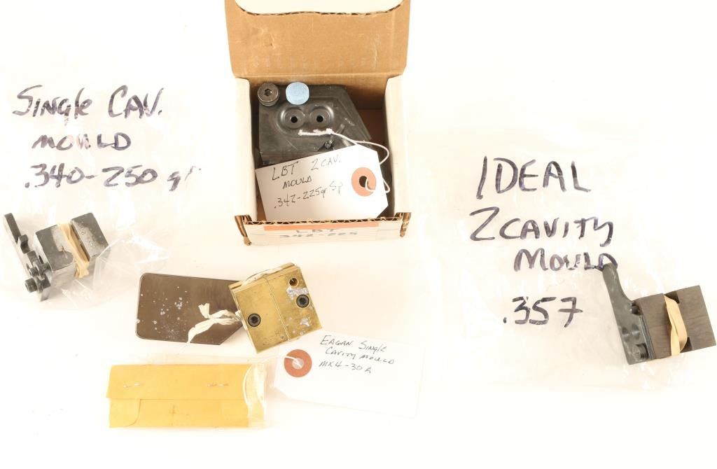 Includes a LBT 2 cavity .342-225gr SP mold, an Eagan single cavity MX4-30 A mold, an Ideal 2 cavity .357 mold, and an unknown single cavity .340-250gr mold. No handles with molds.