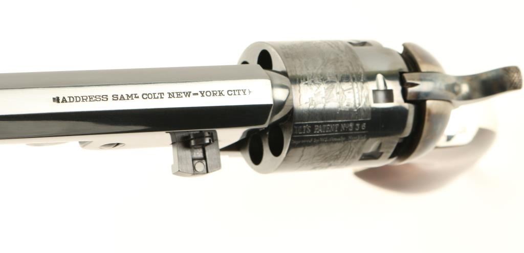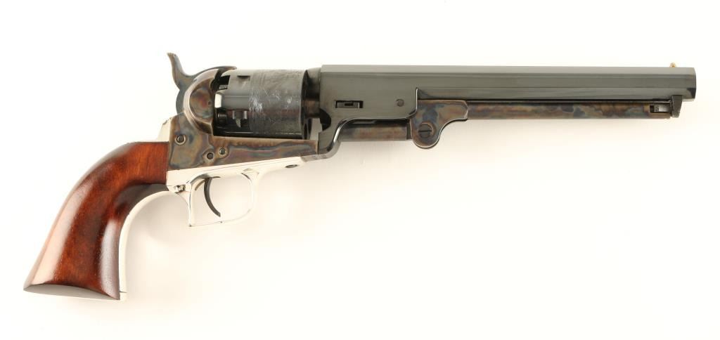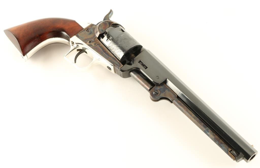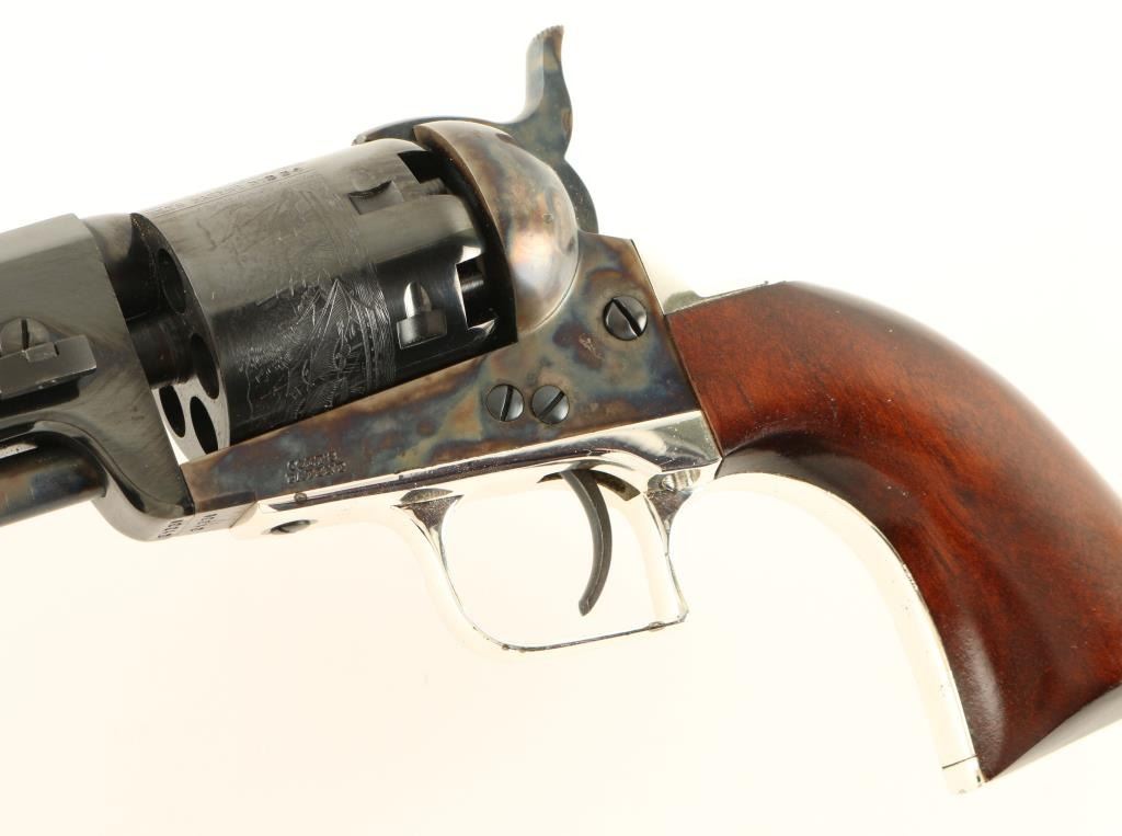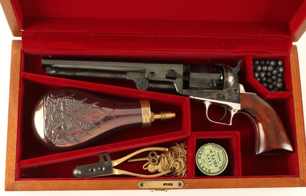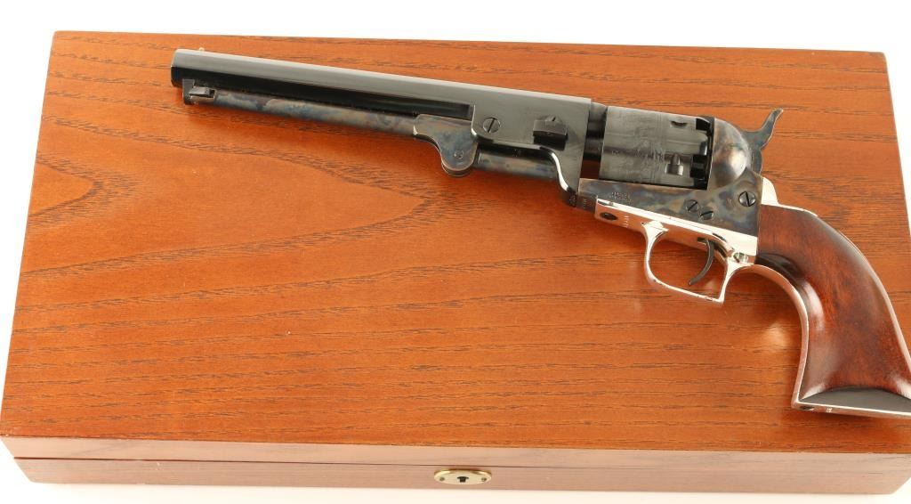'Signature Series' Modern production single action percussion revolver chambered for .36 caliber ammunition. Features a blued 7.5" octagonal barrel, cone front sight, notched rear sight, case hardened loading lever, frame & hammer, blued six shot cylinder with a roll stamped naval scene, nickel plated backstrap & square-back triggerguard, and one piece walnut grips. Includes a custom compartmentalized display case red velvet lining, powder flask, bullet mold, cap container, lead balls and key. Revolver retains approximately 97% of it's original finish showing vivid case colors, beautiful deep bluing and a few small losses on the backstrap. Condition is excellent. ***Antique Firearm***