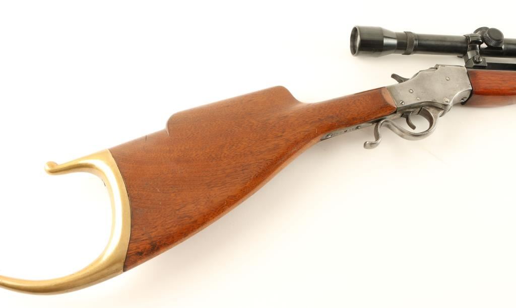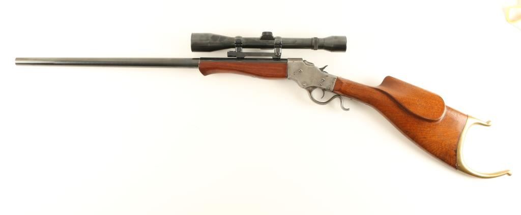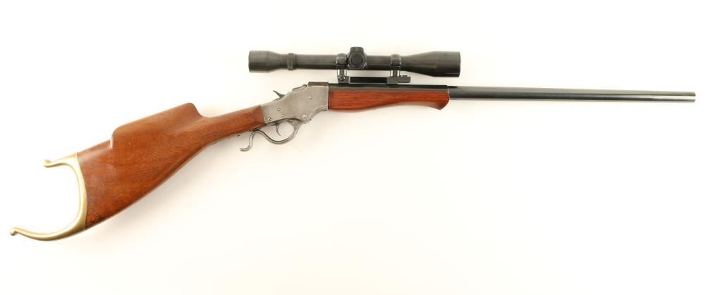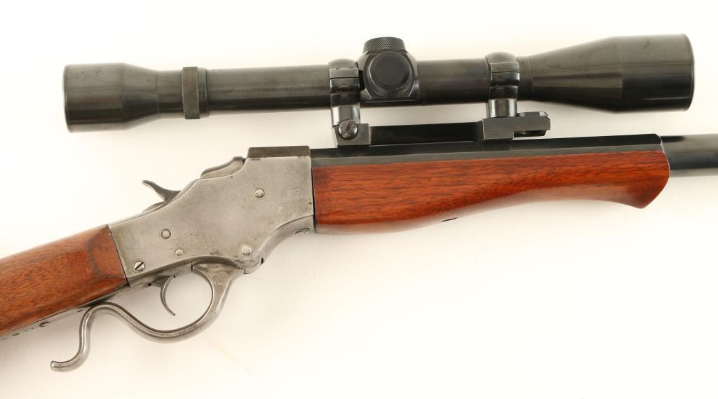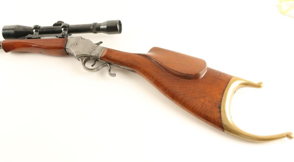 American single shot falling block rifle chambered in .225 Winchester, circa 1903-1916. Features a blued factory style 25 5/8" half octagonal barrel with no marker mark, no provisions for sights, Weaver K61 scope, smooth trigger, 's' shaped lever, checkered hammer spur, smooth contoured walnut forend and Schutzen style shoulder stock with fancy brass buttplate. Barrel retains approximately 99% of it's blued finish while the receiver is in the white showing some remnants of a case hardened finish in protected areas. Action is crisp, bore is excellent and wood stocks are fine. Condition is very good+. ***C&R Firearm*** ***Modern Firearm***