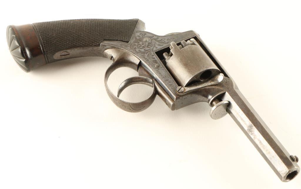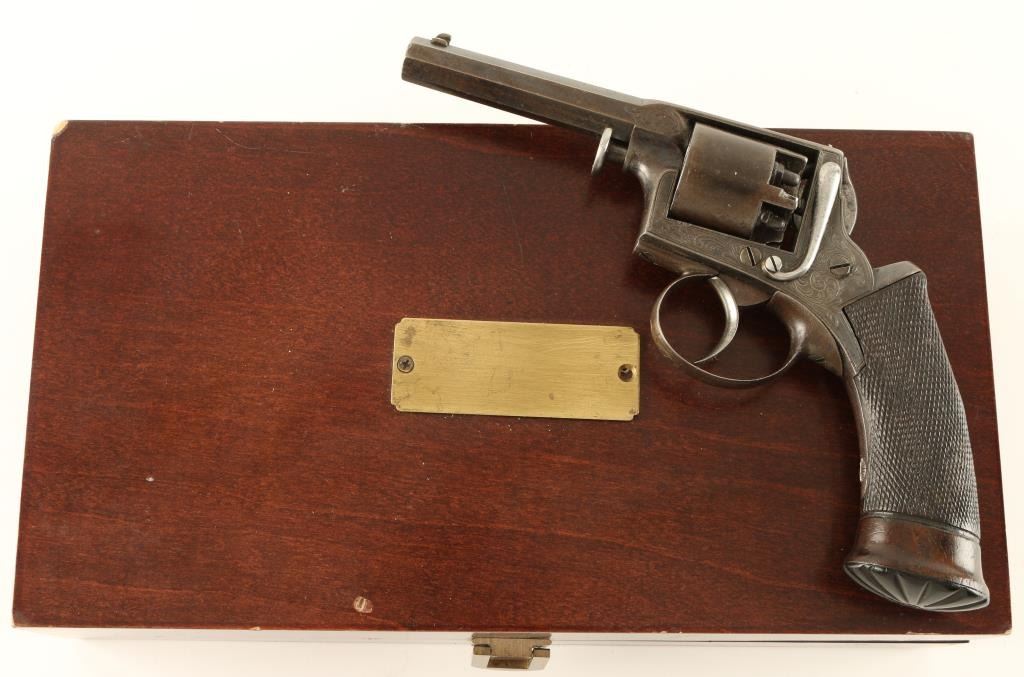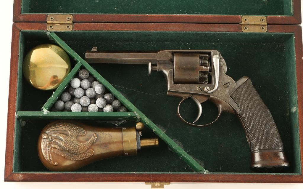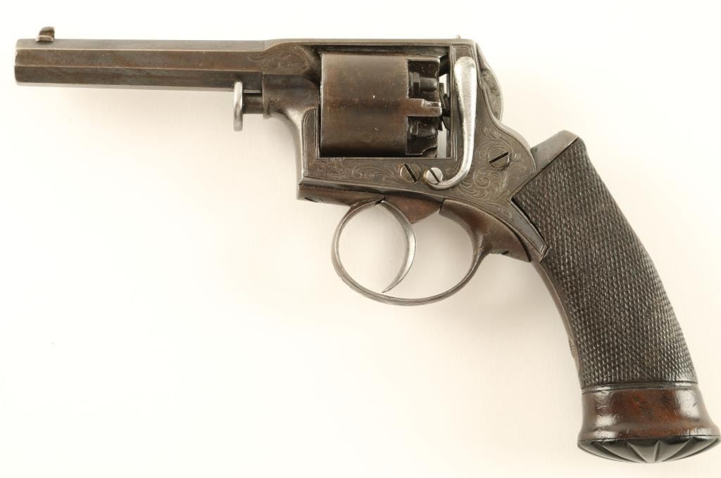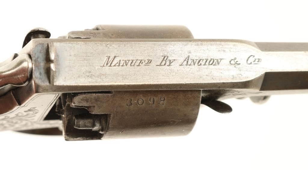 Cased, Belgium made early double action percussion revolver, manufactured by Ancion & Cie circa 1850's. Features a blued finish, 3" octagonal barrel, dovetailed blade front sight, fixed rear window sight, factory scroll engraved frame, five shot non-fluted cylinder, smooth trigger, and finely checkered one piece walnut grips. Includes a custom velvet lined presentation case with powder flask, lead balls, and brass cap container. Matching numbers on frame and cylinder. Revolver exhibits approximately 68% of it's original blued finish with the remained drifting to a brown patina. Action is strong, markings are crisp, bore is good and wood grips are near fine. Condition is near fine. ***Antique Firearm***