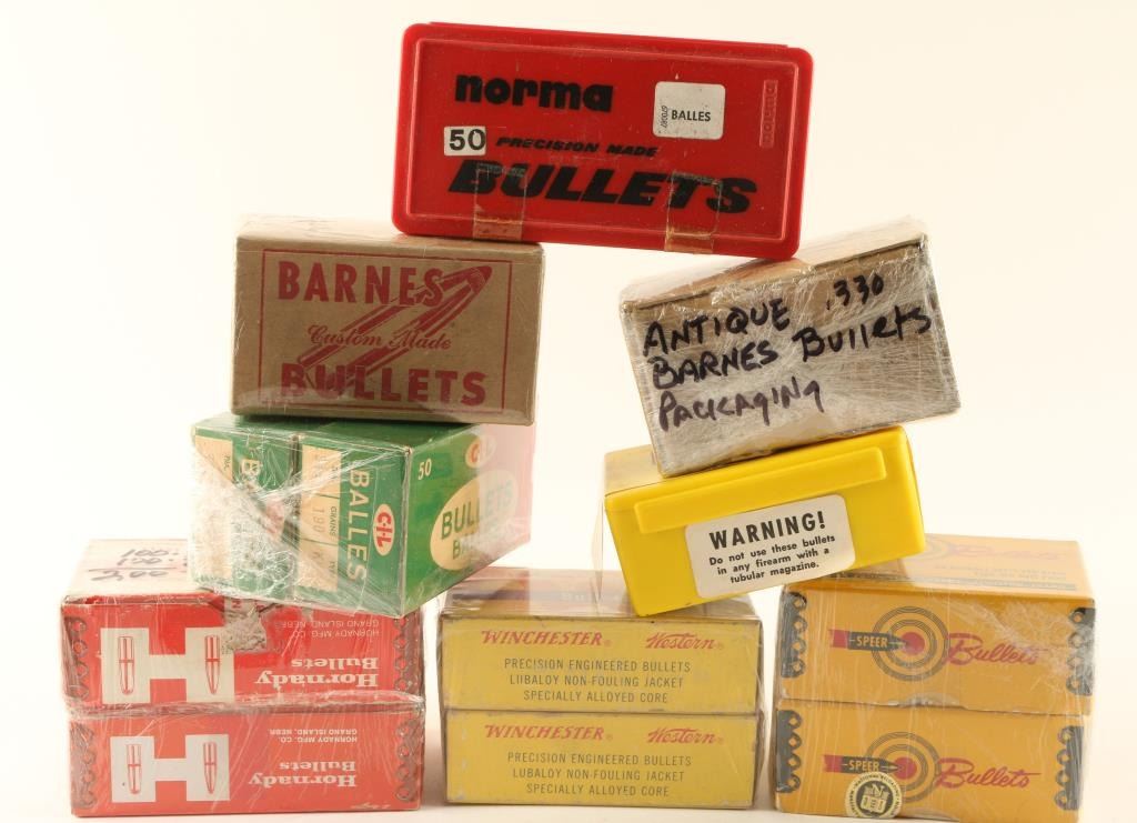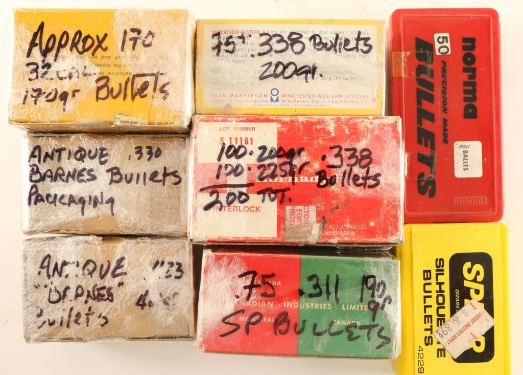 Including approx. 170 rds of Speer .32 bullets, 100 rds of .38 Speer bullets, 50 rds of Norma 9.3mm bullets, 75 rds of .311 Balles SP bullets, 275 rds of .338 bullets, and 114 rds of antique Barnes .330 bullets.