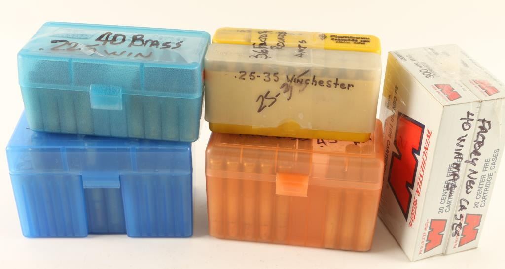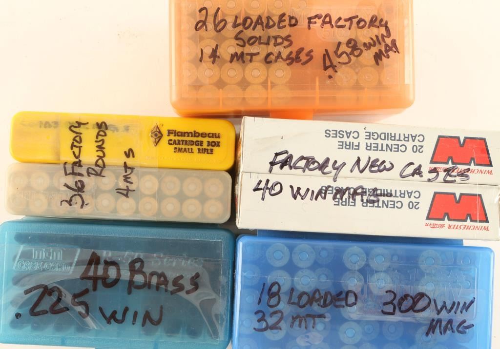 Including 36 rds of .25-.35 WIN, 40 rds of .225 WIN brass, 40 factory new .300 WIN Mag cases, 18 rds of reloads and 32 brass for .300 WIN Mag, 26 rds of factory .458 WIN Mag and 14 cases.