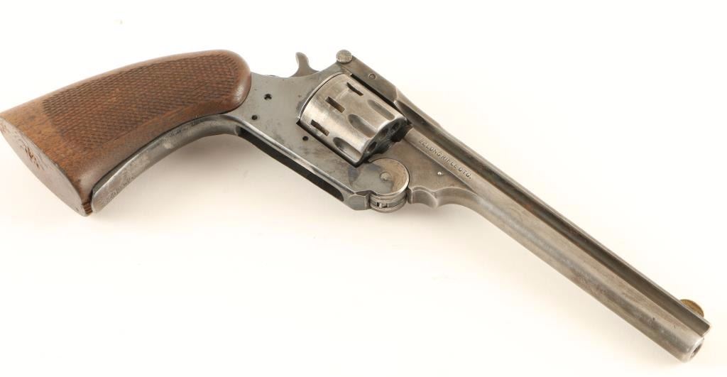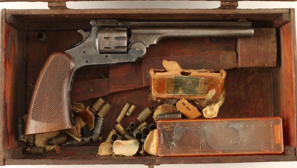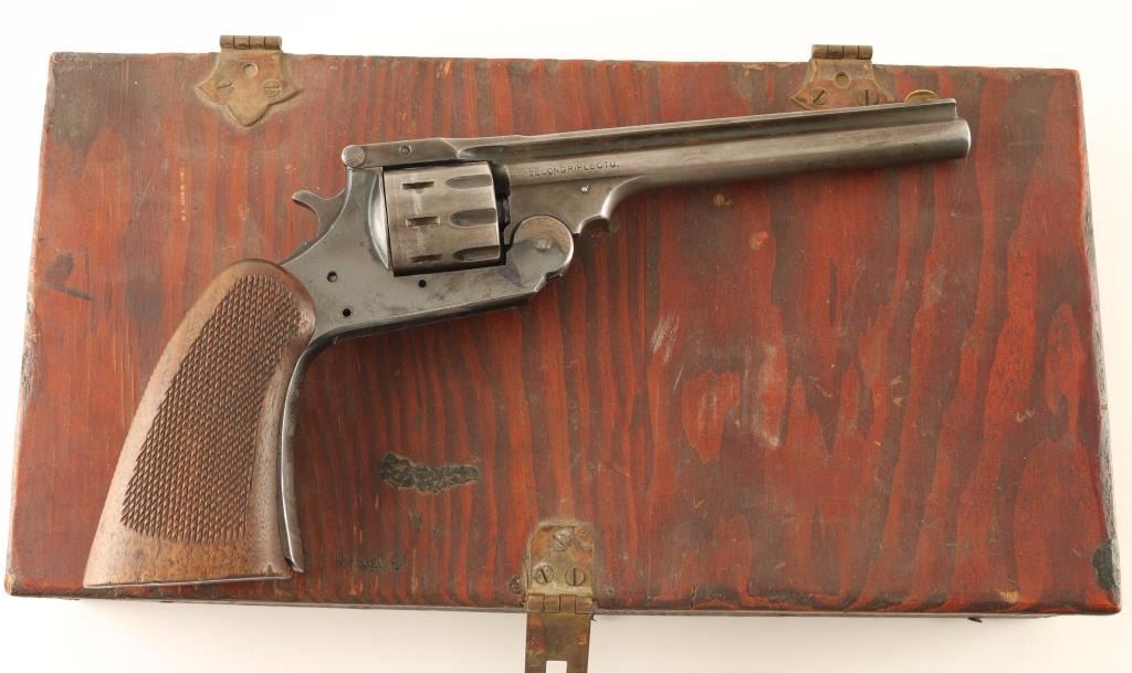 SN: 598155 'Parts Gun' Double action break-open revolver chambered in .22 Long Rifle. Features a blued finish, 6" ribbed barrel, brass blade front sight, fixed rear sight, fluted nine shot cylinder, checkered hammer spur and one piece "sawhandle" style checkered walnut grip. Includes a custom made wood case with the trigger, trigger guard, small internal parts and misc spent brass. Revolver shows finish 80% finish on frame with little to no finish retained on barrel or cylinder. Bore is excellent and grips are near fine with some wear and marring on the bottom. Condition is good as parts. ***C&R Firearm*** ***Modern Firearm***