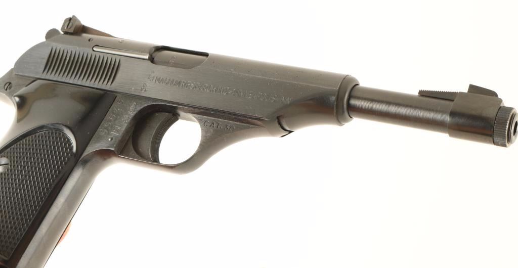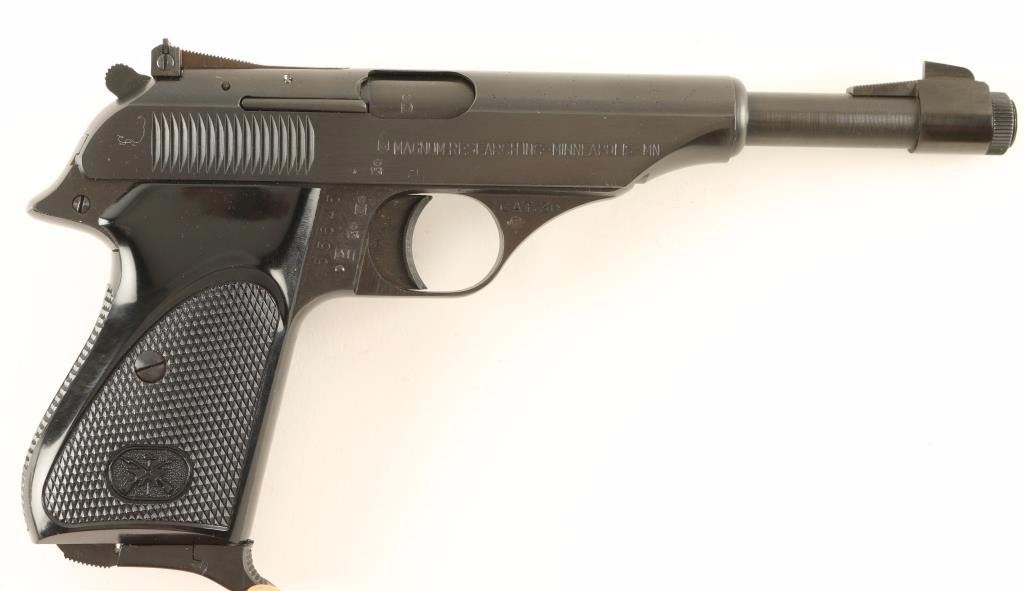 Italian made semi automatic pistol chambered in .22 Long Rifle. Imported by Magnum Research of Minneapolis, Minnesota with import marks on the right side of the slide. Features a blued finish, 6" threaded barrel, ramped front sight, adjustable rear sight, serrated trigger, thumb safety, round serrated hammer spur, 10 round magazine, and black checkered plastic thumb rest grips. Pistol shows little wear with minor imperfections underneath the finish on the slide. Safety does not lock securely and can switch positions if the pistol is jarred. Action is smooth, bore is excellent and grips are fine. Condition is near excellent. ***Modern Firearm***