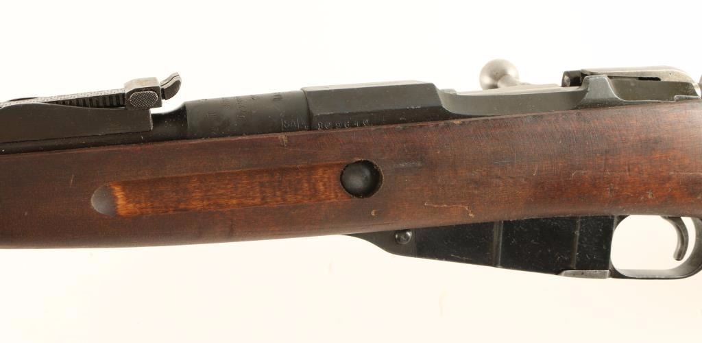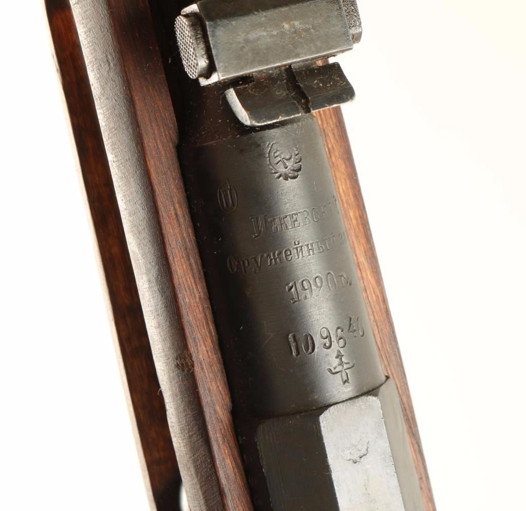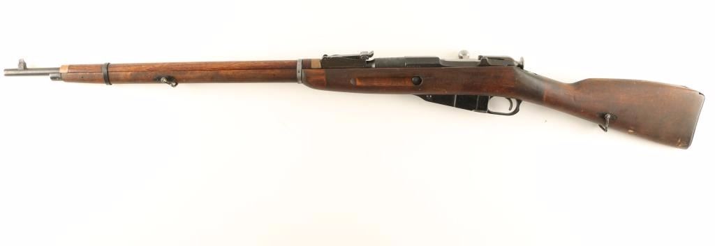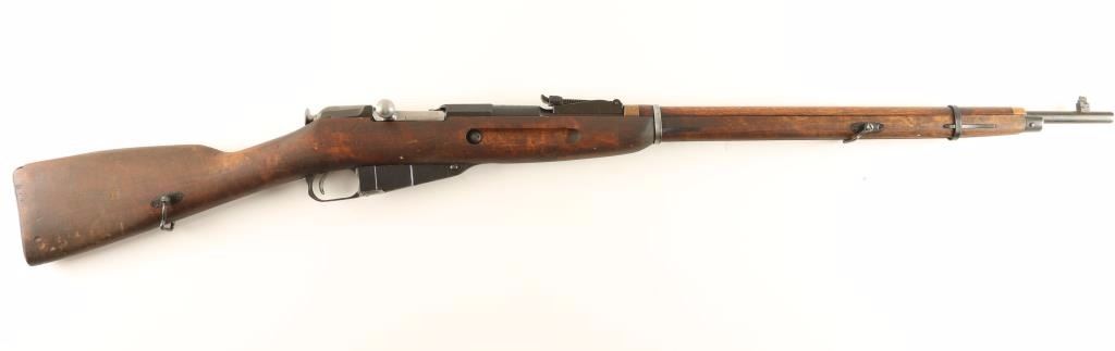 Russian/Finnish military bolt action service rifle chambered in 7.62x54Rmm, circa 1920. Featured a blued finish, Izhevsk & SA marked 28.7" tapered barrel, hooded post front sight, graduated rear sight to 2,000 meters, sling swivels, internal box magazine, straight bolt handle, two barrel bands, smooth wood handguard and finger-jointed straight grip shoulder stock with metal buttplate. Matching serial numbers on barrel & receiver. Import marks on barrel. Finish is approximately 90% intact with light even wear. Action functions well, bore is dark with good rifling and wood stock is good+. Condition is good. ***C&R Firearm*** ***Modern Firearm***
