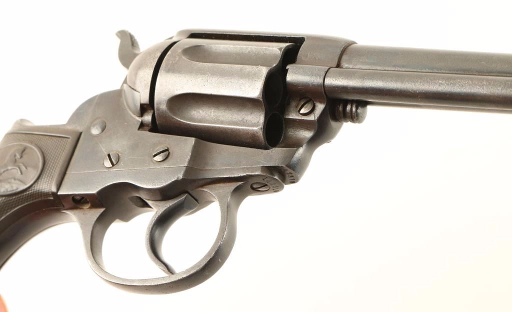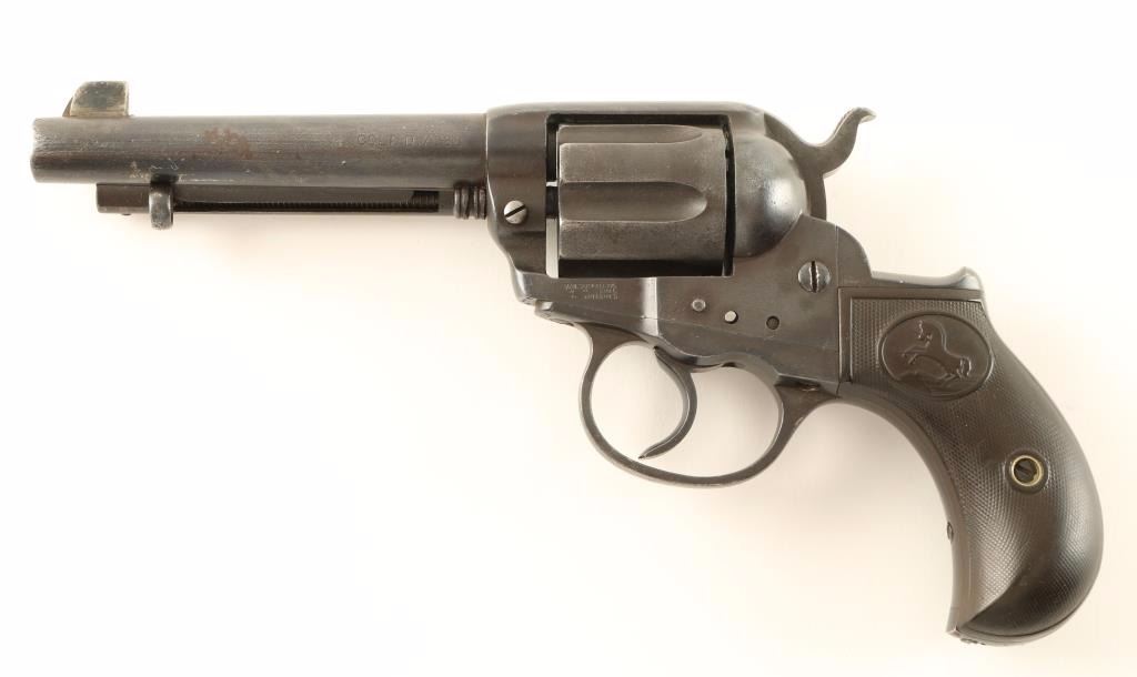 Refinished double action revolver chambered in .38 Colt, circa 1903. Features a blued refinish, 4 3/4" barrel with two line address, bullseye ring ejector, enlarged blade front sight, 'v' notched rear sight, six shot fluted cylinder, smooth trigger, checkered hammer spur, and two-piece bird's head checkered hard rubber Rampant Colt grips. Matching serial numbers on frame, trigger guard and backstrap. Revolver exhibits an even dark grey/black patina showing some light pin prick pitting on the cylinder and a small of light surface rust forming on the left side of the barrel. Action appears to work consistently in both action, bore is very good, markings are mostly legible and grips are good with worn checkering. Condition is good+. ***C&R Firearm*** ***Modern Firearm***