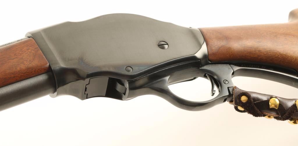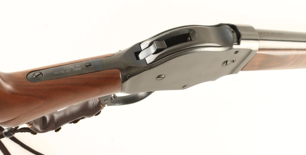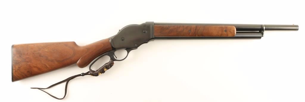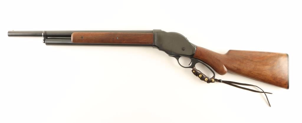 Exposed hammer lever-action repeating shotgun chambered for 2 3/4" 12 Gauge shells. Modeled after the Winchester Model 1887 and imported by I.A.C. of Billerica, Massachusetts with import marks on the lower tang. Features a fully blued finish, 20" barrel, brass bead front sight, 3/4 tube magazine, checkered hammer spur, leather wrapped lever, walnut forend and pistol grip shoulder stock. Includes original factory box. Shotgun shows only slight wear on bolt with approximately 97% finish intact overall. Action is smooth, bore is very good and wood stocks are fine. Condition is excellent. ***Modern Firearm***