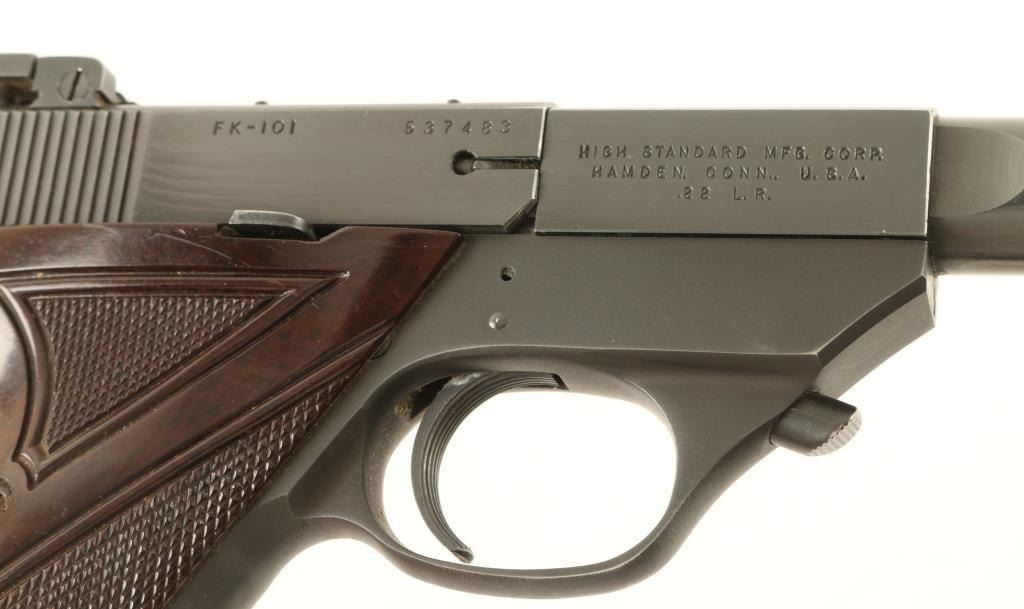 'FK-101' Semi-automatic target pistol chambered in .22 Long Rifle, circa 1954-1957. Features a blued finish, heavy 6 3/4" barrel with integral muzzle break, ramped blade front sight, adjustable rear window sight, push-button take down design, serrated trigger, 10 round magazine, and checkered brown plastic thumb rest grips. Pistol shows some muzzle wear and light edge wear with approximately 91% finish intact. Action is smooth, bore is pristine and grips are fine. Condition is very good+. ***C&R Firearm*** ***Modern Firearm***