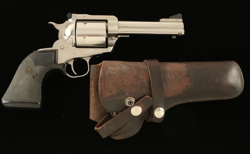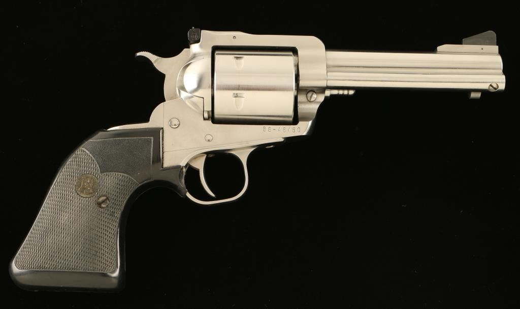 SN: 86-46450 Stainless steel single action revolver chambered in .44 Magnum, circa 1992. Featured a brushed finish, 4.6" barrel, ejector rod, blade front sight, adjustable rear window sight, non-fluted six shot cylinder serrated hammer spur, smooth trigger, and checkered black rubber Presentation Pachmayr grips. Includes a dark brown leather belt loop holster by Hunter. Revolver shows little wear with only few minor blemishes, a drag line and very light surface rust on the left side of the front sight. Action is smooth, bore is bright and grips are fine. Condition is near excellent. ***Modern Firearm***