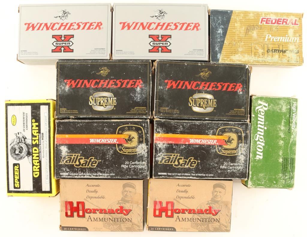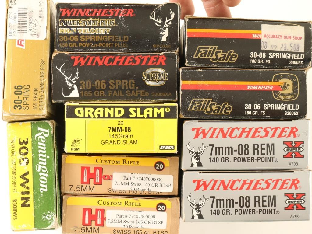 Includes 11 boxes of 30-06, .308 Win, 7.5MM, and 7MM ammo by various makers and some brass.
