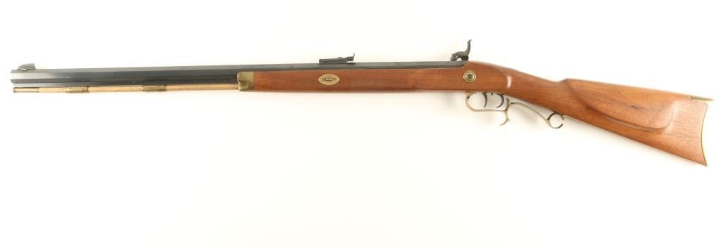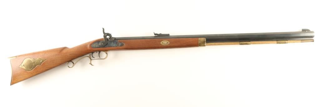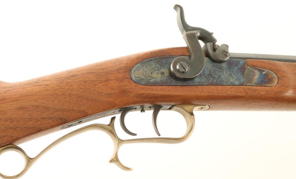 SN: 163978 Modern production .50 caliber percussion rifle in classic Hawken style. Features a blued 28" heavy octagonal barrel, blade front sight, adjustable rear sight, double set trigger, wood ram rod, brass furniture, case hardened lock, finger rest trigger guard, patch box, serrated hammer spur, and full-length select hardwood straight grip shoulder stock. Rifle retains approximately 96% if it's original blued finish with light handling wear. Action is crisp, bore is clear and wood stock is fine. Condition is near excellent. ***Antique Firearm***