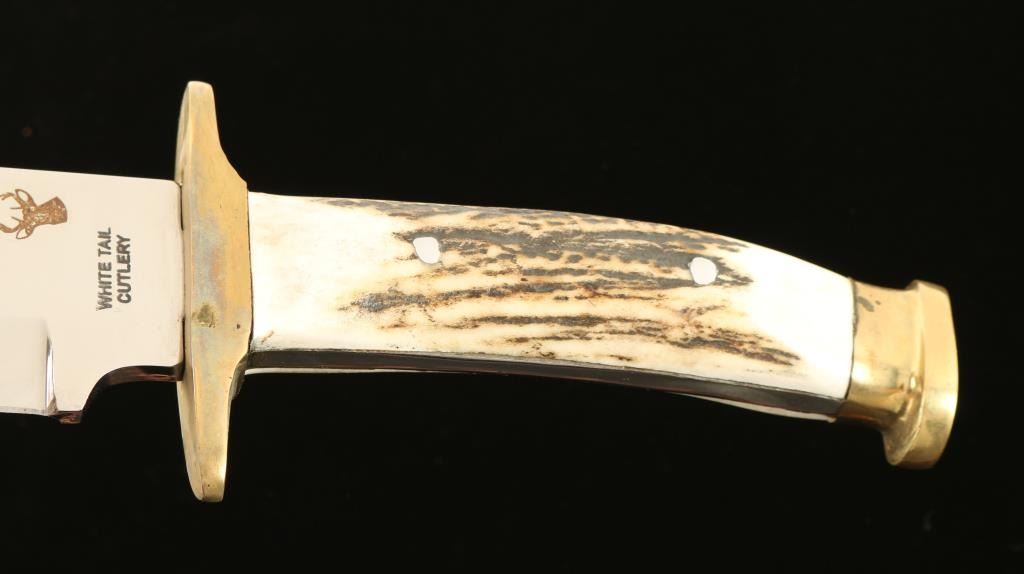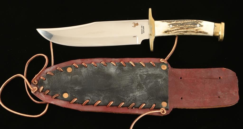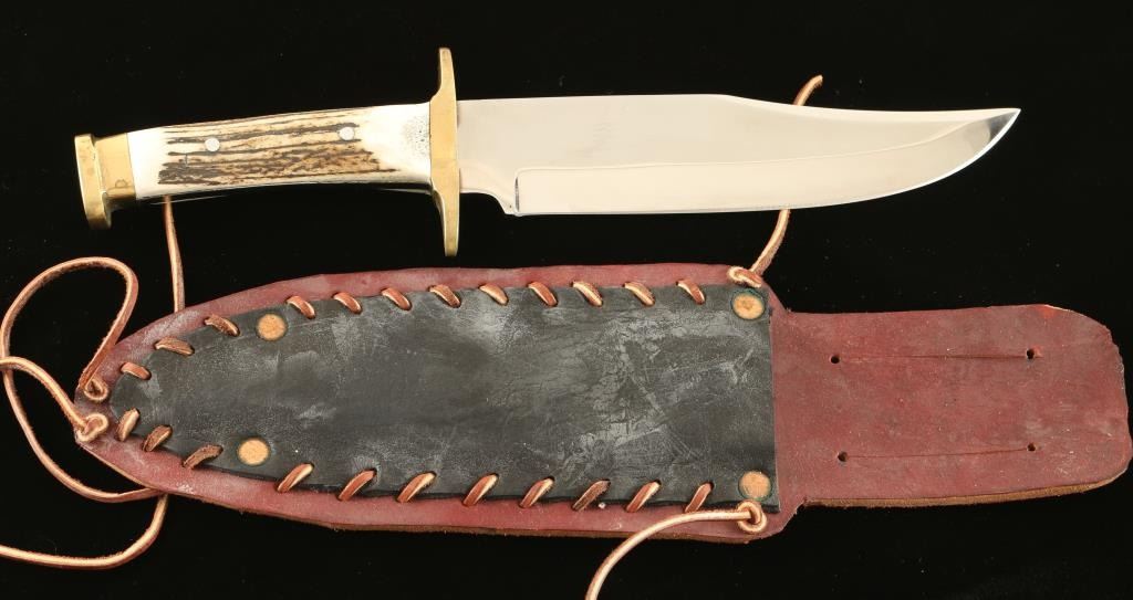 With horn type handle and leather sheath. Blade measures 7 1/2"