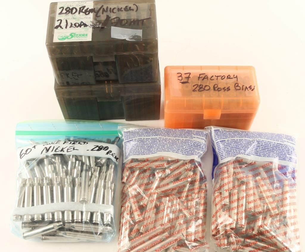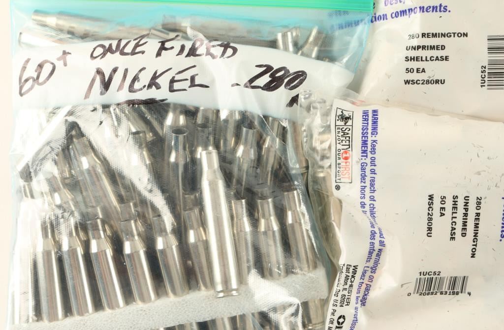 Including 21 reloads & 130 once fired .280 REM nickel shell cases, 100 rds of WIN Nickel shell cases, and 37 factory .280 Ross brass.