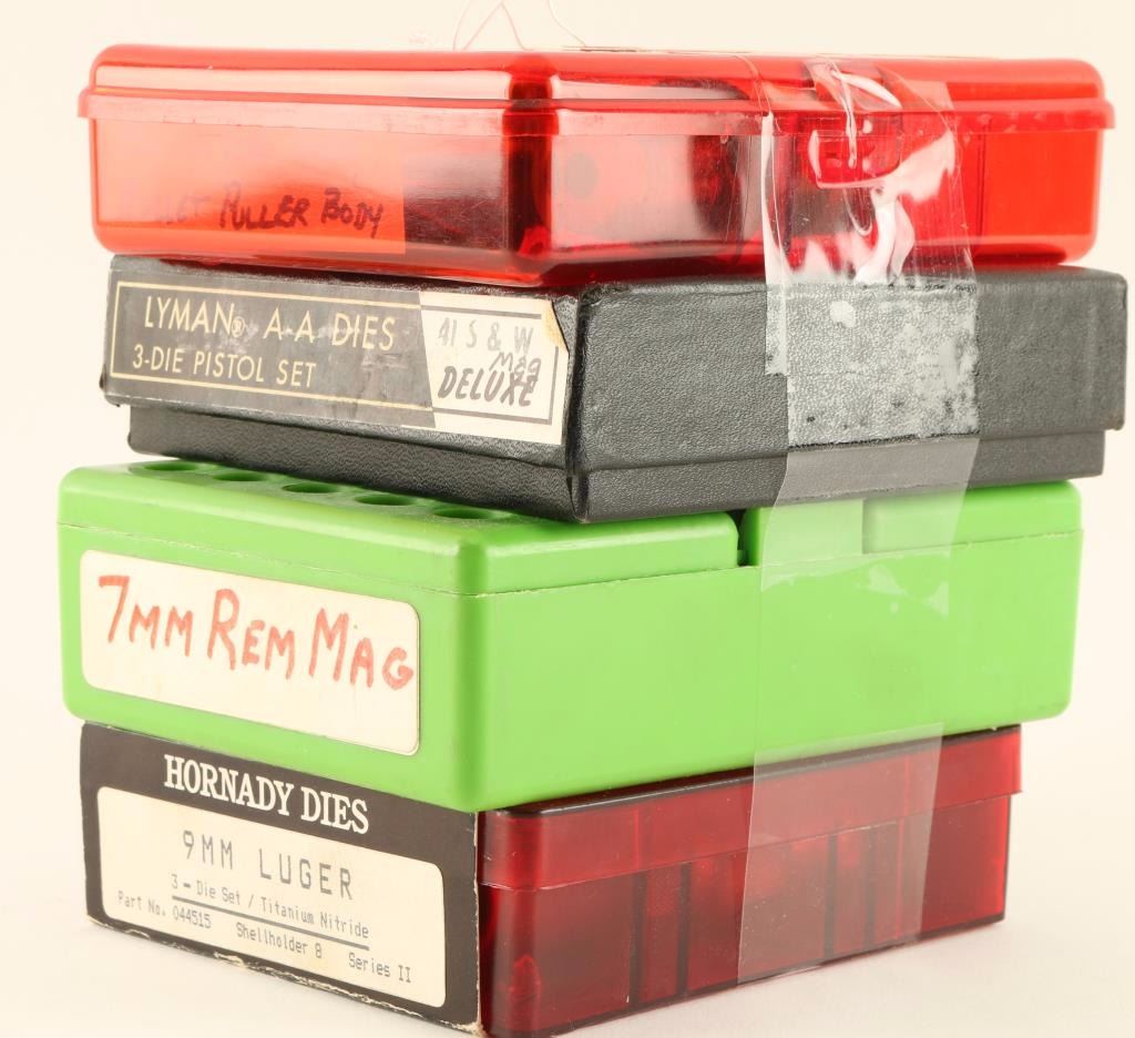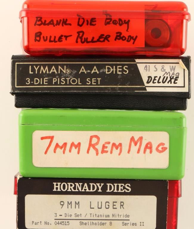 Including .41 S&W Mag 3-Die Pistol Set, 7mm Rem Mag die set, 9mm Luger Hornady die set, and a blank die body and bullet puller body.
