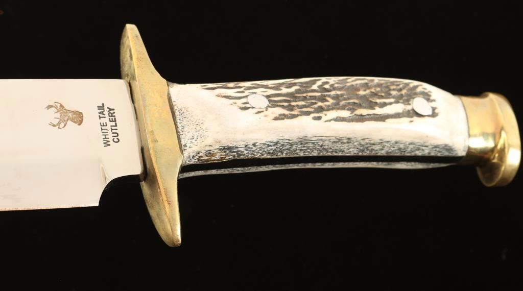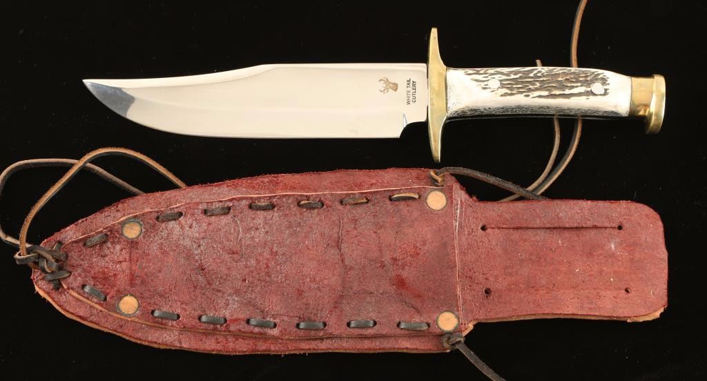 With bone type handle and leather sheath. Blade measures 7 1/4".