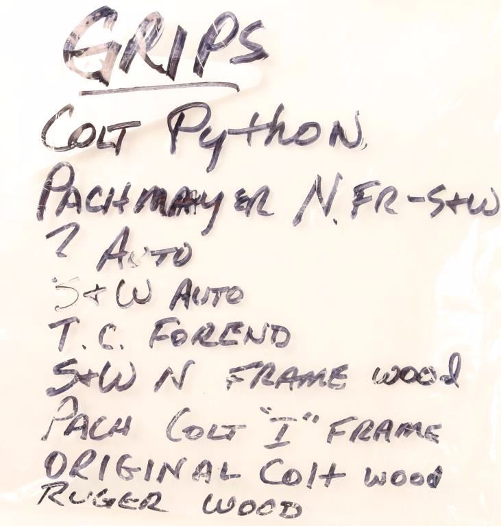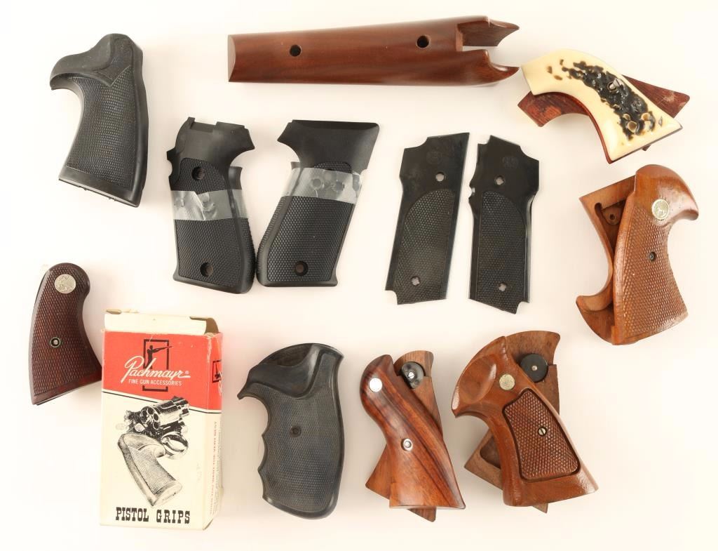 Including 2 pair of Colt Medallian grips (one of which is for the Colt Python), 2 pair of S&W grips, a pair of faux antlered grips, a Thompson Contender foreign and 2 pair of rubber Pachmayr grips