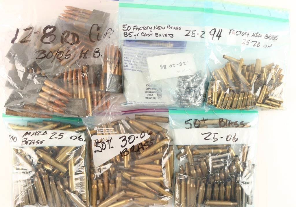 Including approx. 150 rds of 25-06 brass, 144 rds of 25-20 factory new brass, 50 rds of 30-06 brass, and twelve 8 round clips for 30-06 HB