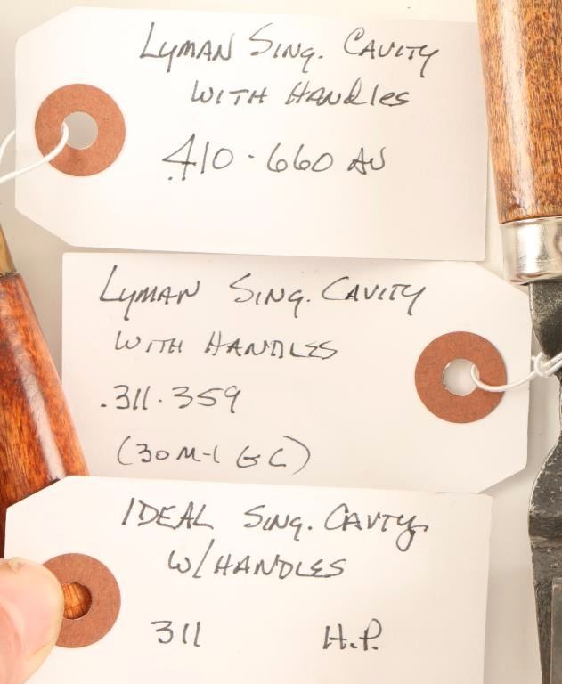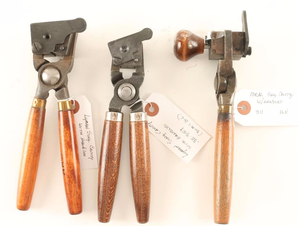 Includes an Ideal single cavity .311 HP, a Lyman single cavity .311 - 359, and a Lyman single cavity .410 - 660 AV, all with wooden handles.