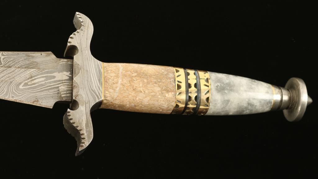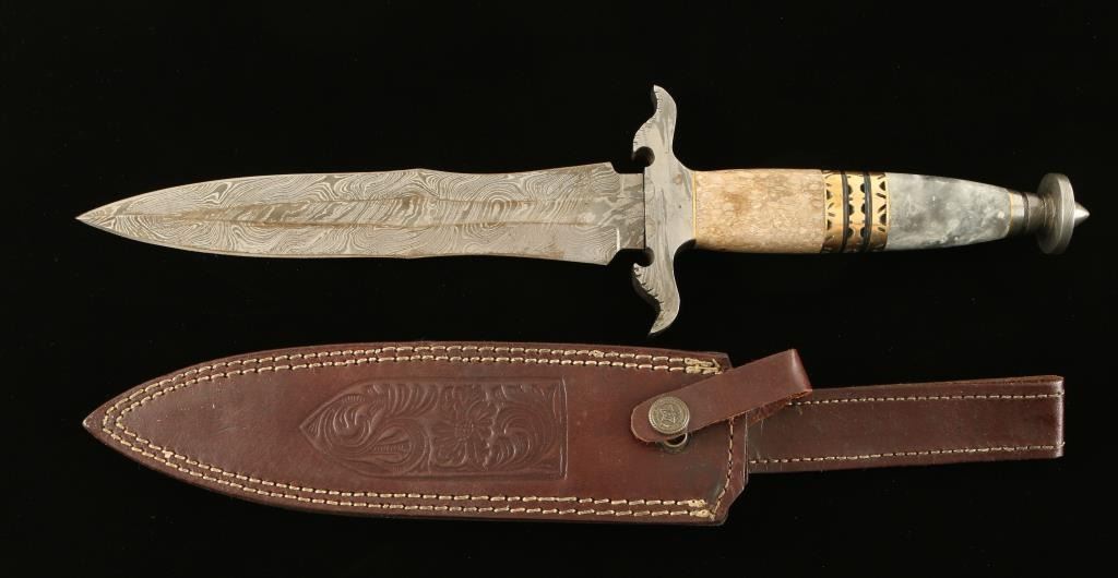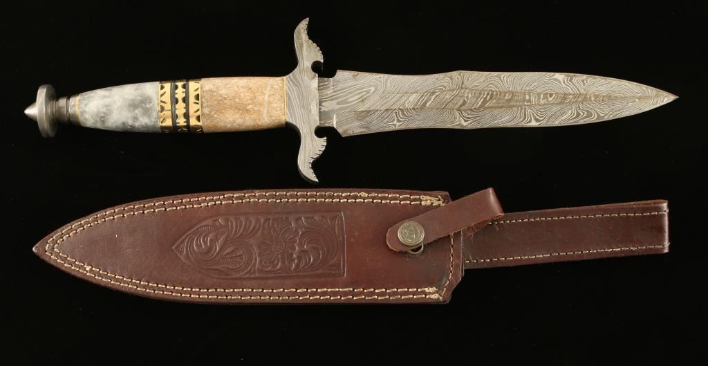 Featuring a Damascus fixed blade measuring 8 3/4", a beautiful faux stone & brass handle, and a tooled leather sheath.