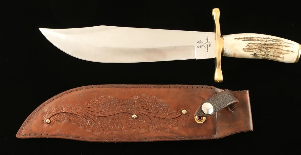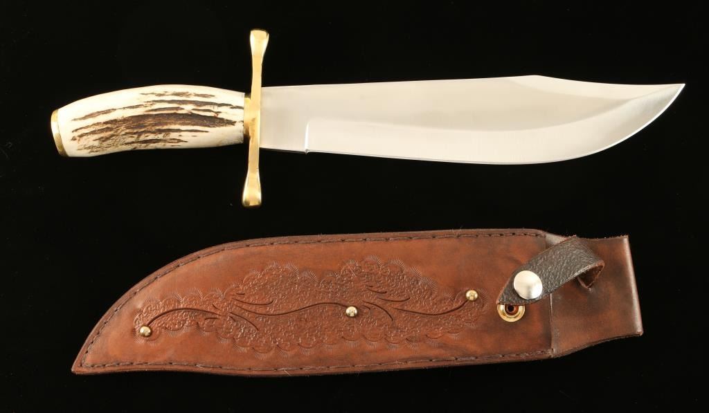 Featuring an Ostrich handle and custom leather sheath. Measures 14" overall with an 8 1/2" blade.