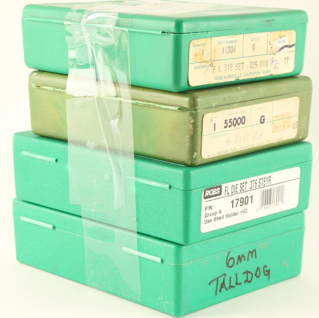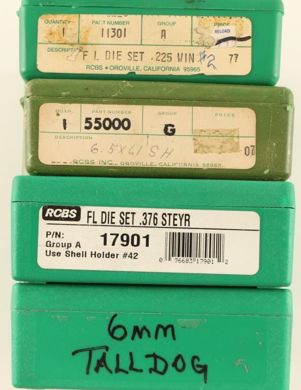Including .225 WIN die set, 6.5 x 61 SH die set, .376 STEYR die set, and 6mm Tall Dog die set.