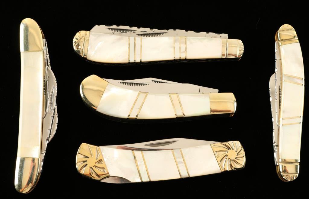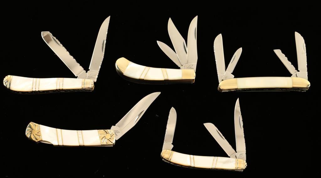 Includes the double blade 'Trapper', the multi-blade 'Swayback', the multi-blade 'Saddlehorn', the single blade 'Lockback', and the multi-blade 'Stockman' pocket knives. Each with beautiful Mother-of-Pearl inlay.