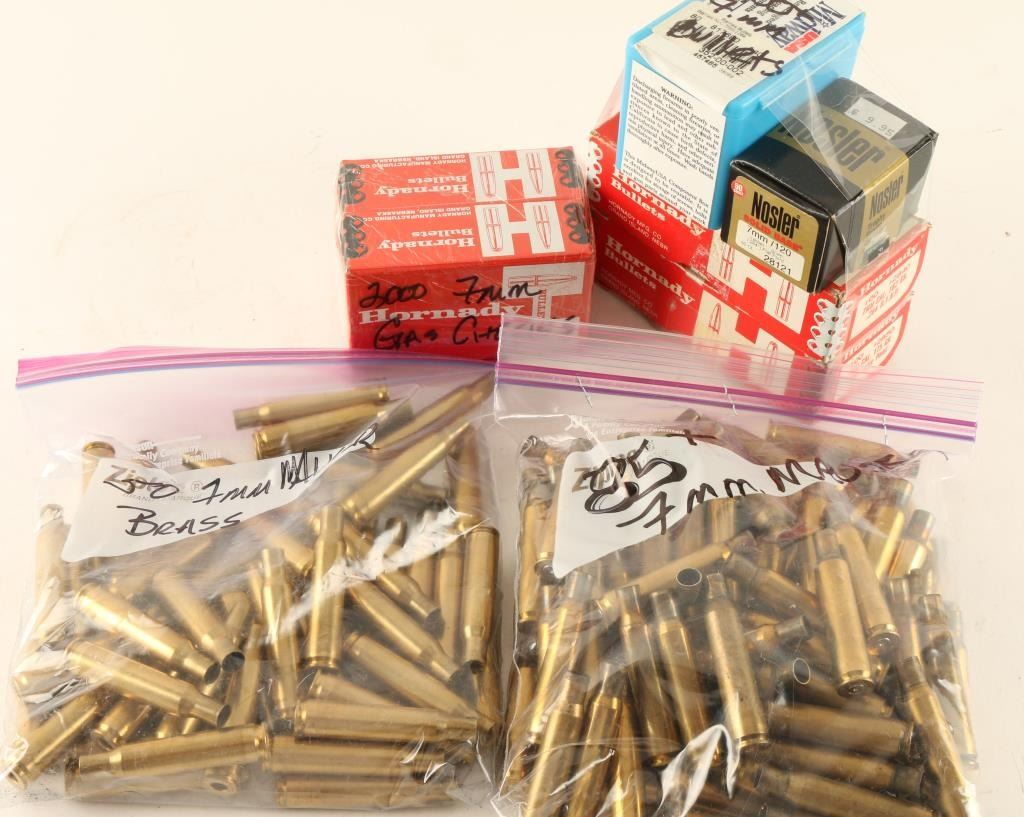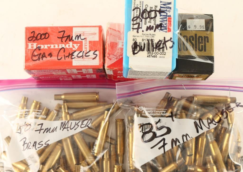 Including 135 7mm Mauser brass, 2000 Hornady gas checks, and 200 bullets by various makers.