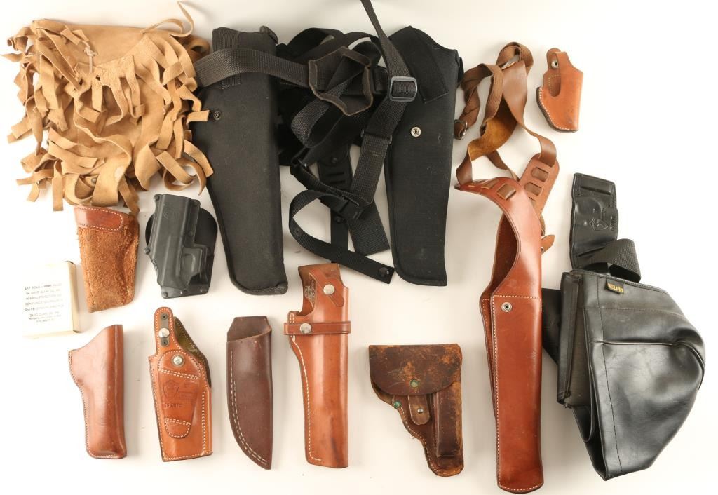 Large lot of holster of various sizes and types. Brands include Uncle Mikes, S&W, Kolpin, Bianchi, Safari Land and more.