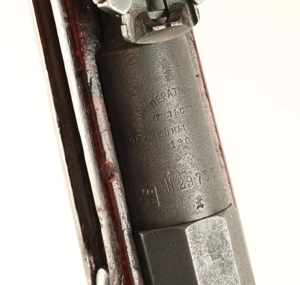 Arsenal reconditioned Russian bolt action service rifle chambered in 7.62x54R, circa 1906. Features a blued finish, 31.6" barrel, blade front sight, ladder rear sight, 5 round internal box magazine, hex receiver, cleaning rod, Tula Imperial marking, straight bolt handle, smooth wood handguard and full length straight grip shoulder stock with metal buttplate. Matching serial numbers on barrel, bolt & receiver. Import marks on barrel. Finish is approximately 60% intact overall with pin prick pitting on the barrel and receiver. Action performs well, bore is dark with good rifling and wood stock is good. Condition is good. ***C&R Firearm*** ***Modern Firearm***