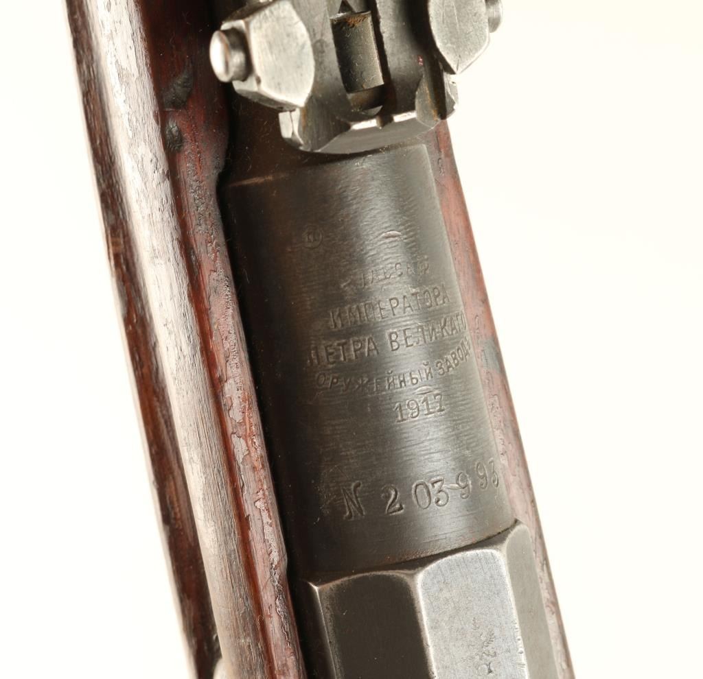 Arsenal reconditioned Russian bolt action service rifle chambered in 7.62x54R, circa 1917. Features a blued finish, 31.6" barrel, blade front sight, ladder rear sight, 5 round internal box magazine, hex receiver, Tula "Peter the Great" Imperial marking, straight bolt handle and full length straight grip wood shoulder stock with metal buttplate. Matching serial numbers on barrel & receiver. Import marks on barrel. Missing front barrel band. Finish is approximately 75% intact with edge wear and heavy wear on the barrel near the muzzle. Action performs well, bore is dark with good rifling and wood stock is good. Condition is good. ***C&R Firearm*** ***Modern Firearm***