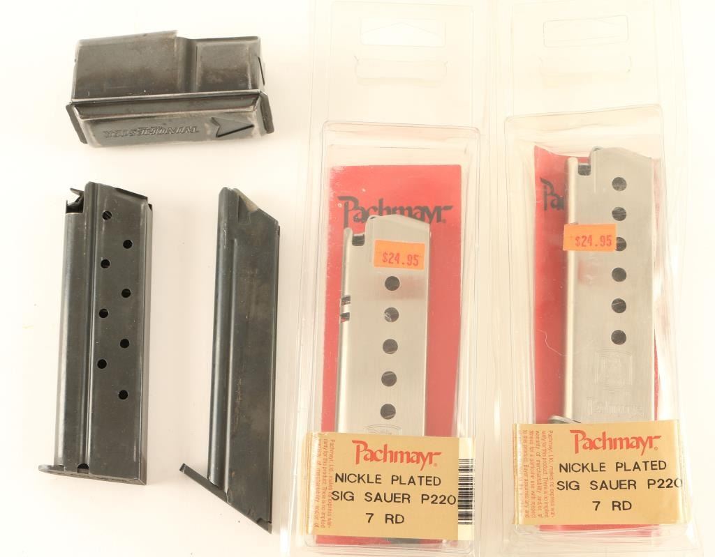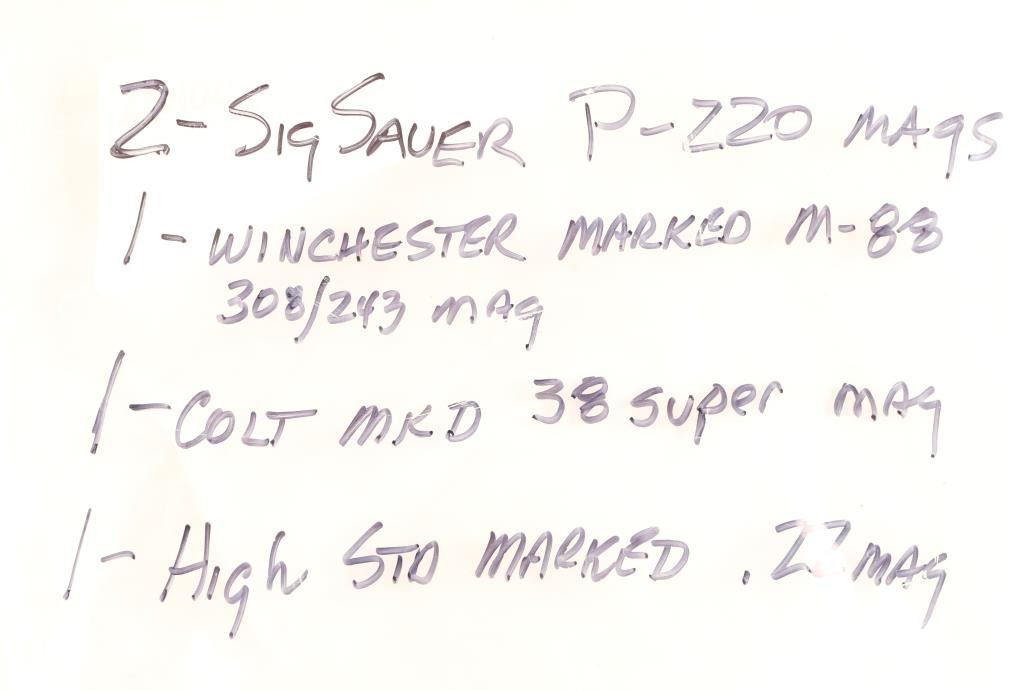 Includes 2 Sig Sauer P-220 mags, 1 Winchester (marked M-88) .308/243 mag., 1 Colt MKD .38 Super mag., and 1 High Standard .22 mag.