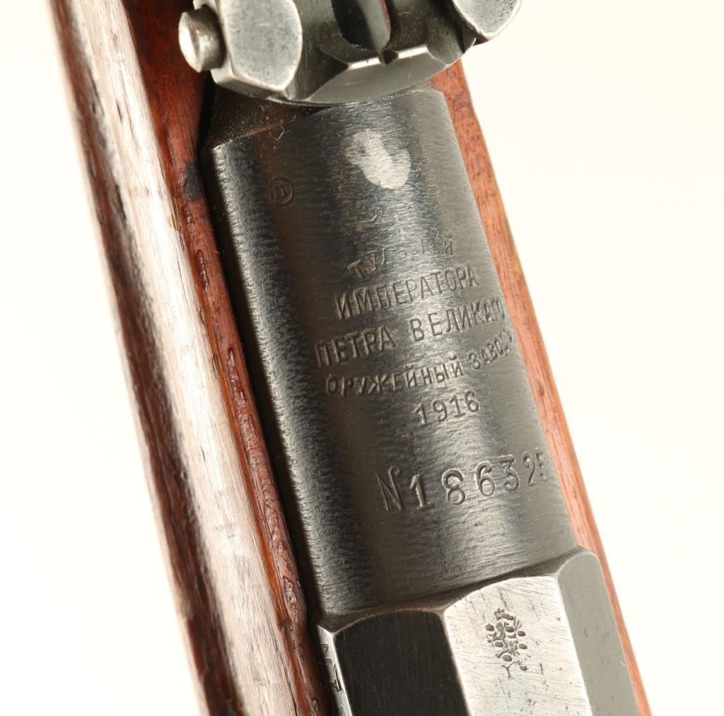 Arsenal reconditioned Russian bolt action service rifle chambered in 7.62x54R, circa 1916. Features a blued finish, 31.6" barrel, blade front sight, ladder rear sight, 5 round internal box magazine, hex receiver, Tula "Peter the Great" Imperial marking, straight bolt handle and full length straight grip wood shoulder stock with metal buttplate. Matching serial numbers on barrel, floorplate & receiver. Import marks on barrel. Finish is approximately 90% intact. Action performs well, bore is dark with good rifling and wood stock is good. Condition is good+. ***C&R Firearm*** ***Modern Firearm***