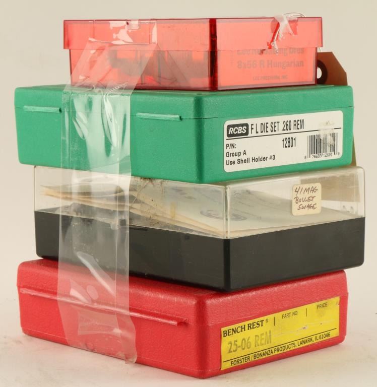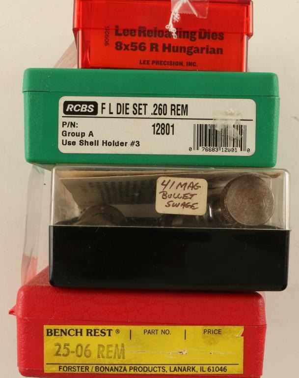 Including Lee 8x56 Rimmed Hungarian reloading dies, .260 REM die set, 25-06 REM Bench Rest, and .41 Mag Bullet Swage.