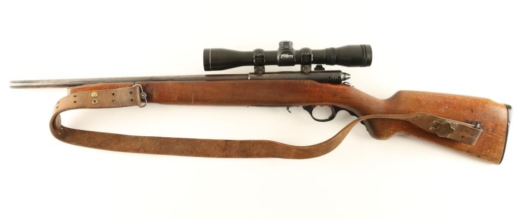 'Parts gun' Magazine fed bolt action sporting rifle chambered foe .22 Short & Long Rifle. Features a blued finish, 18.3" barrel, no sights, Tasco Pronghorn 4x scope, no magazine, manual safety, brown leather sling, serrated trigger, black plastic finger groove trigger guard, folding vertical grip wood forend and pistol grip shoulder stock. Little finish remains with a brown patina forming. Bolt slides out of the receiver freely and does not close consistently. Missing some parts, bore is bright and wood stock shows a chip the the left side forend. Condition is fair as parts. ***Modern Firearm***