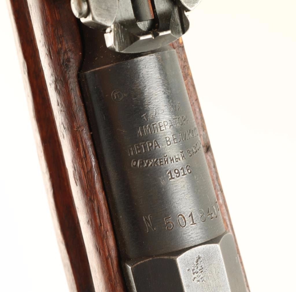 Arsenal reconditioned Russian bolt action service rifle chambered in 7.62x54R, circa 1916. Features a blued finish, 31.6" barrel, blade front sight, ladder rear sight, 5 round internal box magazine, hex receiver, Tula "Peter the Great" Imperial marking, straight bolt handle, smooth wood handguard and full length straight grip shoulder stock with metal buttplate. Matching serial numbers on barrel & buttplate. Import marks on barrel. Finish is approximately 90% intact. Action performs well, bore is dark with good rifling and wood stock is good. Condition is good. ***C&R Firearm*** ***Modern Firearm***