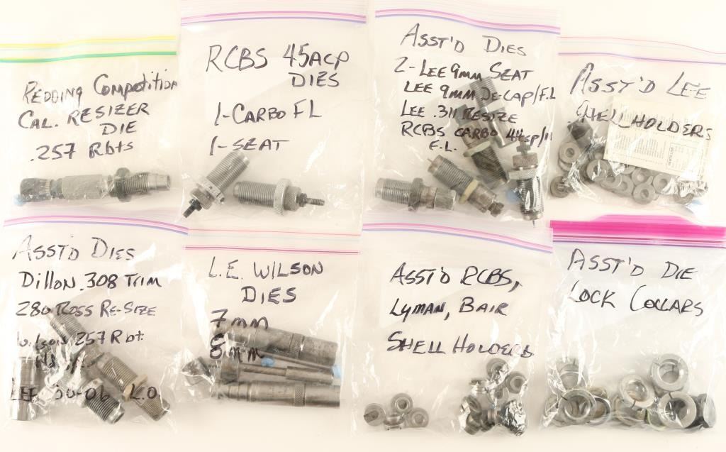 Includes assisted die lock collars, Lee shell holders, Wilson dies for 7mm & 8mm, assisted dies for .308 Trim, .280 Ross, .257 Robert, and 30-06 LO. Also RCBS .45 ACP dies, assisted dies for 9mm, .311 resizer, a .44 SPL. , and a Redding competition caliber re-sizer die for .257 Roberts.