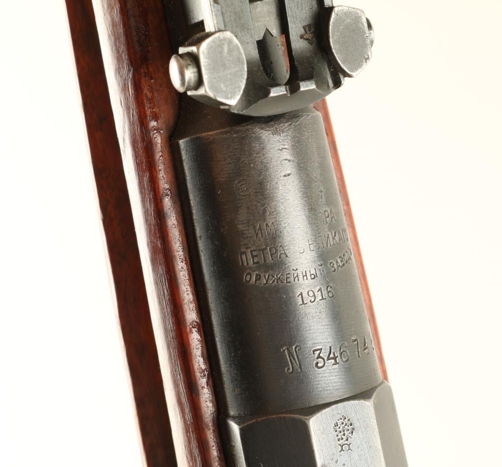 Arsenal reconditioned Russian bolt action service rifle chambered in 7.62x54R, circa 1916. Features a blued finish, 31.6" barrel, blade front sight, ladder rear sight, 5 round internal box magazine, hex receiver, Tula "Peter the Great" Imperial marking, straight bolt handle, and full length straight grip wood shoulder stock with metal buttplate. Matching serial numbers on barrel, receiver & buttplate. Import marks on barrel. Finish is approximately 80% intact with small dings on the barrel and some light surface rust emerging. Action performs well, bore is dark with good rifling and wood stock is good+. Condition is good. ***C&R Firearm*** ***Modern Firearm***