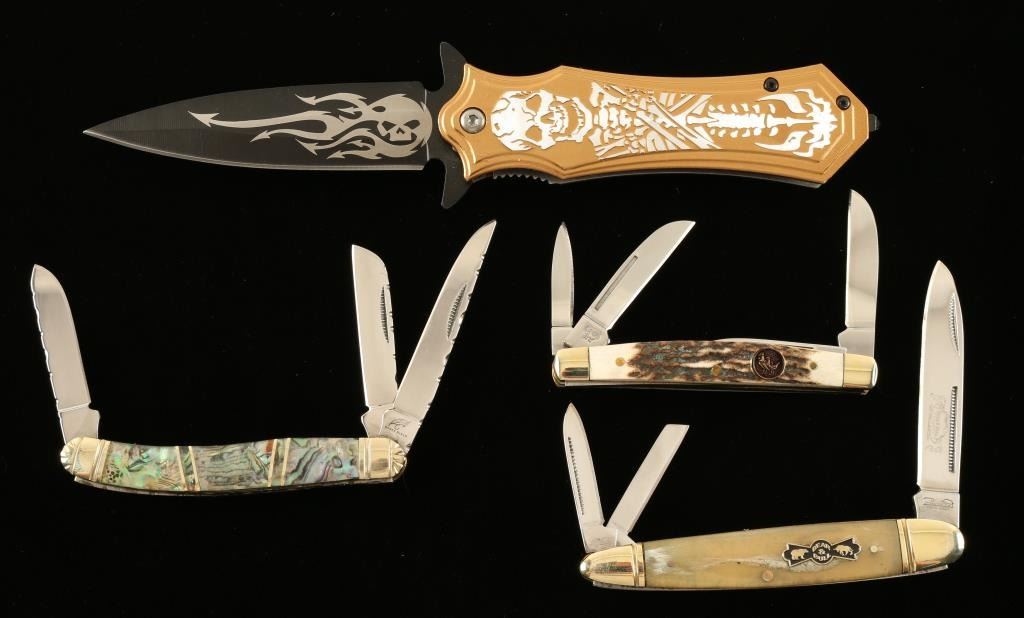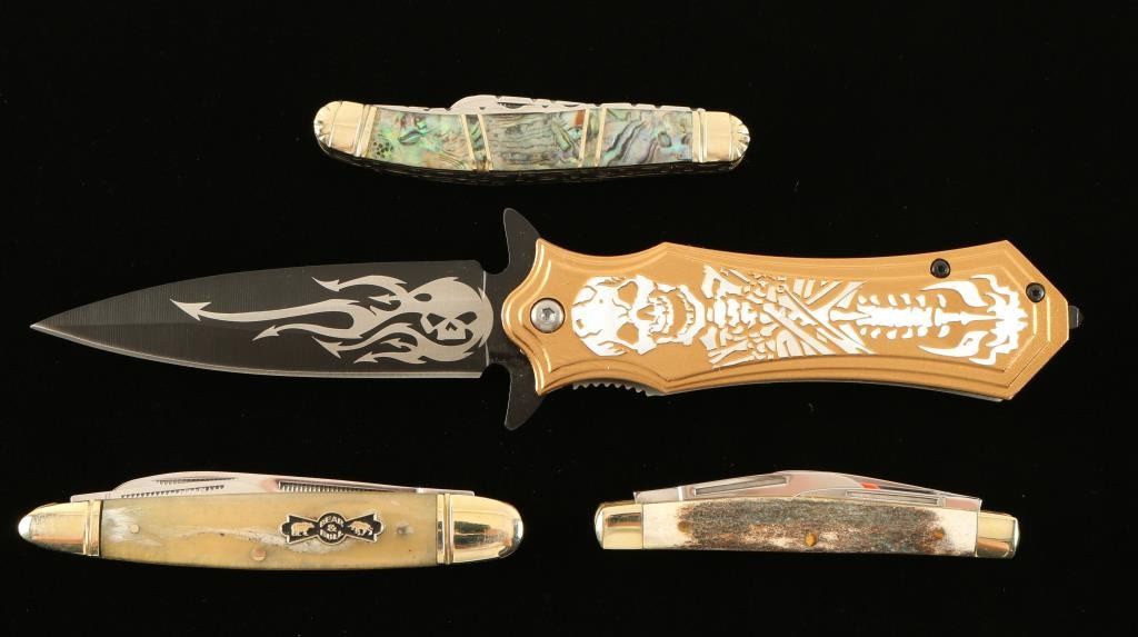 Includes a Hen & Rooster Father's day German Mystery multi-blade pocket knife, a Trac Force single blade Skull & Bones pocket knife, a Ocoee River Cutlery multi-blade pocket knife, and a Frost Cutlery Bear & Bull Whittler multi-blade pocket knife.