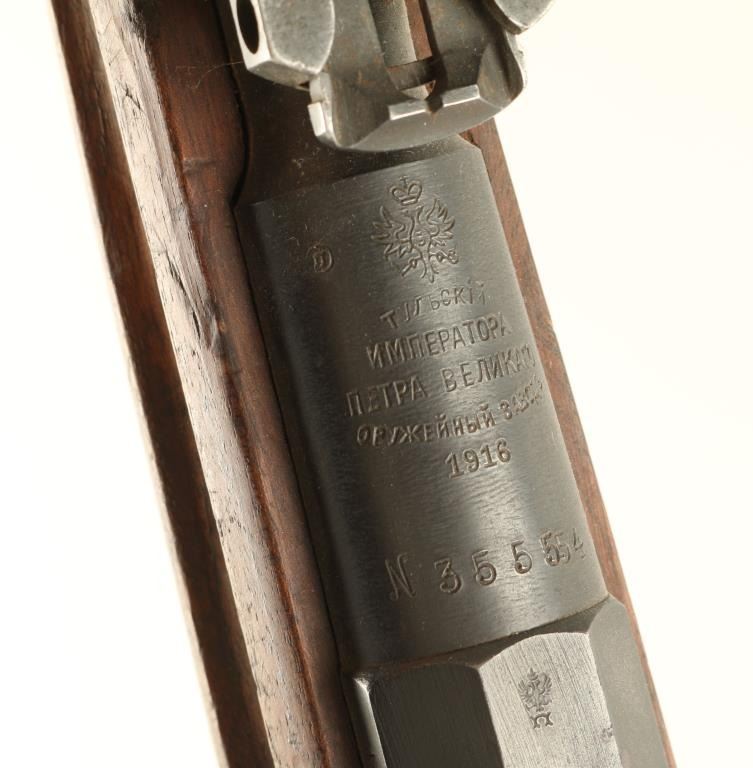 Arsenal reconditioned Russian bolt action service rifle chambered in 7.62x54R, circa 1916. Features a blued finish, 31.6" barrel, blade front sight, ladder rear sight, 5 round internal box magazine, hex receiver, Tula "Peter the Great" Imperial marking, straight bolt handle, and full length straight grip wood shoulder stock with metal buttplate. Matching serial numbers on barrel & receiver. Import marks on barrel. Finish is approximately 90% intact. Action performs well, bore is dark with good rifling and wood stock is good. Condition is good. ***C&R Firearm*** ***Modern Firearm***