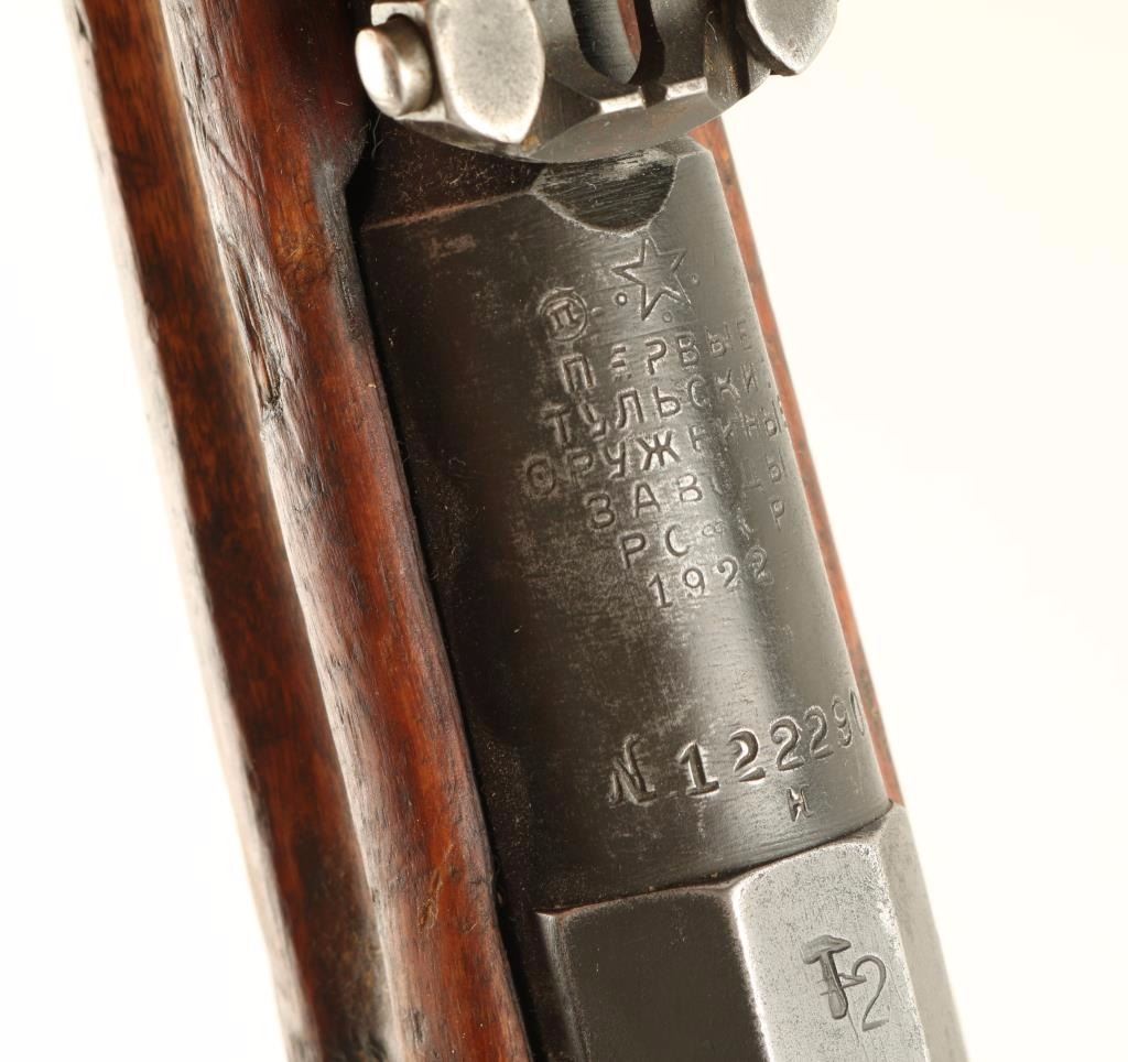 Arsenal reconditioned Russian bolt action service rifle chambered in 7.62x54R, circa 1922. Features a blued finish, 31.6" barrel, blade front sight, ladder rear sight, 5 round internal box magazine, hex receiver, Tula "PCFCP", 1st pattern marking, straight bolt handle, smooth wood handguard and full length straight grip shoulder stock with metal buttplate. Matching serial numbers on barrel & receiver. Import marks on barrel. Finish is approximately 75% intact showing wear from a bayonet on the barrel. Action performs well, bore is dark with good rifling and wood stock is good. Condition is good. ***C&R Firearm*** ***Modern Firearm***